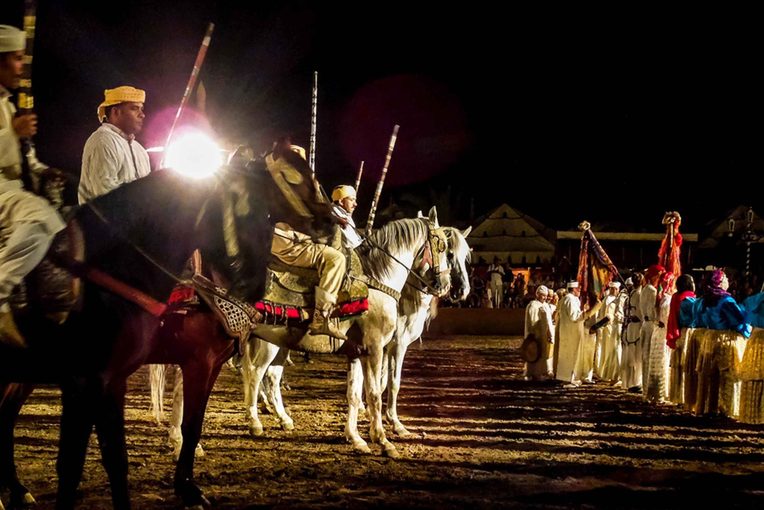 Include il trasporto di andata e ritorno dal tuo alloggio a Marrakech Cena tradizionale marocchina in una vivace tenda berbera Spettacolare spettacolo di Fantasia con cavalli, musica e fuochi d'artificioEasy cancellation