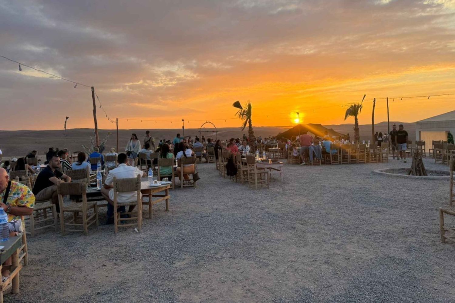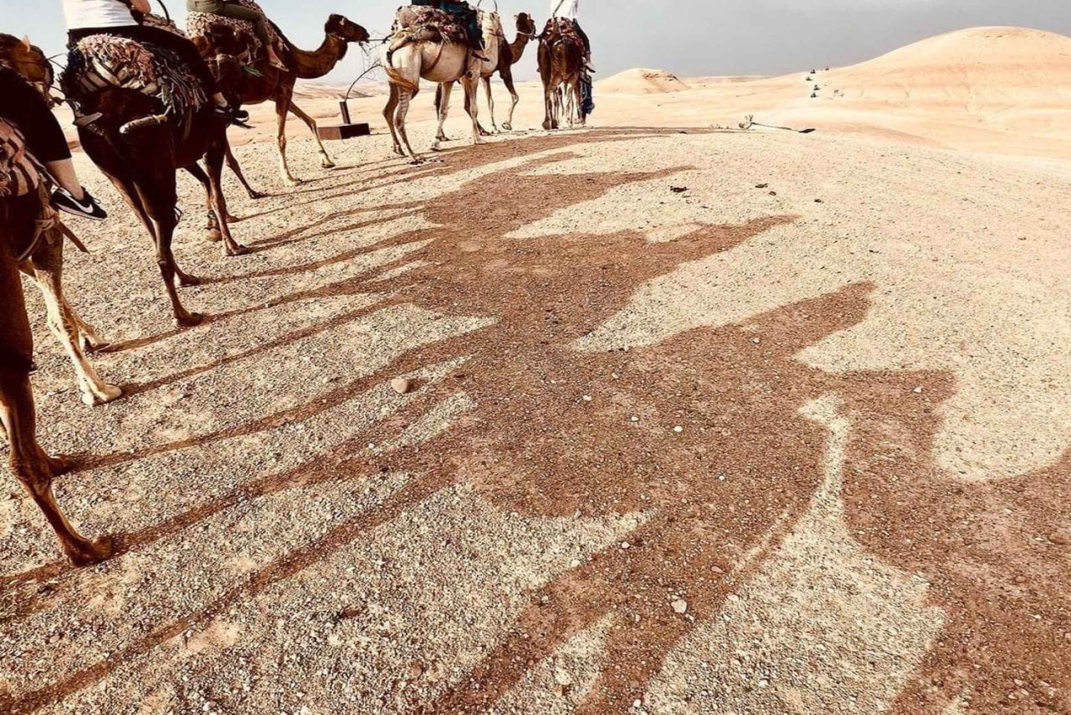 Preparati per un viaggio indimenticabile da Marrakech al deserto di Agafay, dove ti aspettano avventura, paesaggi mozzafiato e l'autentica cultura marocchina. Se sogni una serata ricca di emozioni, tramonti magici e sapori tradizionali, questa esperienza nel DESERTO DI AGAFAY è proprio quello che fa per te. Il tuo viaggio nel deserto di Agafay Dopo un breve tragitto in auto attraverso la pittoresca periferia, ti ritroverai circondato dalla bellezza unica del deserto di Agafay, appena fuori dalla vivace città. A differenza del Sahara sabbioso, il deserto di Agafay a Marrakech offre un paesaggio roccioso e lunare altrettanto mozzafiato. L'avventura ti aspetta Magica escursione in cammello nel deserto Goditi un tranquillo giro in cammello a Marrakech mentre il sole tramonta sul deserto di Agafay. Questo giro in cammello nel deserto offre lo scenario perfetto per ricordi indimenticabili: immagina il tuo giro in cammello al tramonto, con il cielo dipinto di colori vivaci che creano uno sfondo perfetto. Che tu stia cercando un giro in cammello a Marrakech, un giro in cammello nel deserto o semplicemente sognando i migliori cammelli di Marrakech, questo magico trekking supererà le tue aspettative. Il nostro team di professionisti renderà il tuo giro in cammello nel deserto sicuro e indimenticabile. Autentica cena marocchina sotto le stelle Al calar della notte, la tua serata continua con una cena tradizionale marocchina nello splendido Agafay Desert Camp. Assapora piatti appetitosi come il tagine, il couscous, insalate fresche e frutta di stagione. Mentre ceni sotto le stelle, sarai intrattenuto da musica tradizionale dal vivo e spettacoli culturali che danno vita allo spirito del Marocco. Niente è paragonabile a un giro in cammello nel deserto seguito da una serata confortevole al campo, circondati dalla tranquillità della notte di Agafay. Perché questa esperienza è imperdibile - Emozioni e avventura: a Marrakech* con un tranquillo *giro in cammello a Marrakech*. - Autentica cultura marocchina: assaggia piatti tradizionali e assisti a spettacoli culturali. - Comodità e comfort: rilassati con un comodo servizio di trasferimento da e per Marrakech, che renderà il tuo viaggio senza stress. - Perfetto per tutti: che tu sia un viaggiatore solitario, una coppia, una famiglia o un gruppo, l'esperienza *Marrakech Desert Tours* è pensata per tutti. I posti sono limitati, prenota ora e crea ricordi indimenticabili con la tua avventura definitiva da Marrakech al deserto di Agafay!Includes
