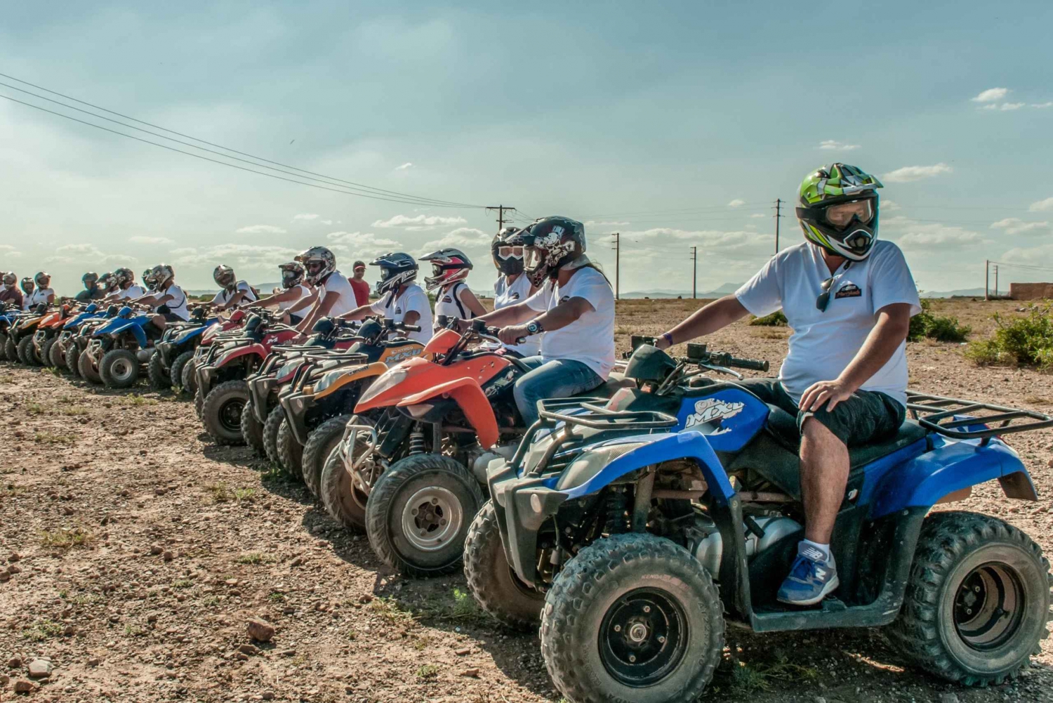 Dopo essere stato prelevato dal nostro autista dal tuo hotel o dal punto di incontro designato, verrai accolto nell'area delle attività in quad. Una volta lì, la tua guida esperta ti fornirà un briefing sul funzionamento del quad e le istruzioni di sicurezza. Dopo aver indossato il casco e gli occhiali di protezione, partirai per un giro in quad e inizierai prima con un giro di prova di 5 o 10 minuti, poi andrai a esplorare il deserto e le oasi di Marrakech per 2 ore. Durante il tour sono previste due pause. La prima pausa si svolge nell'oasi delle Palme, consentendo di scattare foto indimenticabili, mentre la seconda pausa offre la possibilità di rigenerarsi con un profumato tè alla menta e delicati pasticcini marocchini a bordo piscina in una villa (bidouin), offrendo la possibilità di fare un tuffo rinfrescante in piscina a tuo piacimento. I circuiti sono adatti a tutti i livelli, dai principianti ai piloti più esperti. Al termine dell'escursione, l'autista ti riporterà in hotel o al punto di incontro iniziale. N.B. L'età minima per guidare un quad è di 16 anni. I bambini sotto i 16 anni possono guidare il quad dietro a un adulto come passeggero.
