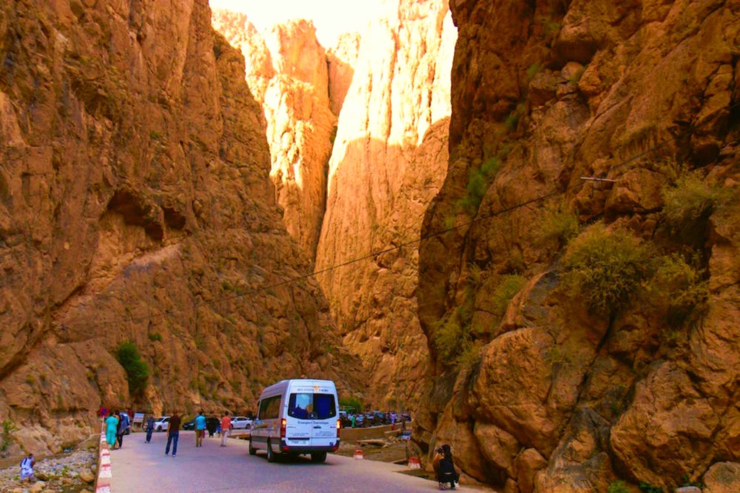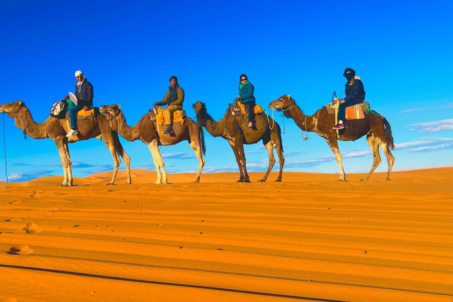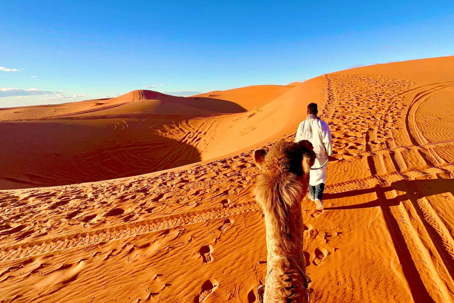 マラケシュからワルザザート、スコーラ、ローズバレー、ダデス渓谷、トドガ渓谷、メルズーガ砂漠を経由する3日間の砂漠ツアーです。風景の美しい道路、多様な色合いの美しい風景、沿道のベルベル人の村々をお楽しみください。ワルザザートから、ユネスコ世界遺産のカスバ・アイト・ベン・ハドゥとタウリルトを訪れ、オアシス、パームツリー、峡谷を通過します。谷と乾いた川を渡り、メルズーガに到着後、砂丘での美しい日没をラクダ乗りで楽しみ、伝統的なモロッコ料理のディナーショーを楽しみながら、砂漠のキャンプで星空の下で一泊します。 エルグ・チェビ砂丘の真ん中でベベルテントで一泊します。1日目:マラケシュ - ティジ・ン・ティシュカ - アイト・ベン・ハドゥ - ワルザザート - ダデス渓谷。 朝8時にホテルを出発し、マラケシュからワルザザートへ向かいます。ハイアトラス山脈のティジ・ン・ティシュカ(2,260m)を越え、いくつかのベルベル人の村を通過し、昼食休憩とアイト・ベン・ハドゥのカスバ見学を行います。 昼食後、スコーラの椰子林へ進み、カサブ・アムリディルを訪問し、ローズの谷を経由してダデス渓谷へ旅を続けます。夕方にブーマルネ・ダデスに到着し、ホテルで夕食と宿泊をします。 2日目:ダデス渓谷 - ティネジャダ - エルフード - メルズーガ 朝、朝食後、トドガの渓谷とパームグローブを訪れます。その後、ティネジャダ(ベルベル人の村)経由でエルフード(化石の都)へ向かう砂漠の道を続けます。 その後、エルグ・チェビの壮大な砂丘へ向けて冒険の旅を続けます。車両を降りてラクダに乗り換え、砂丘の真ん中で日没を眺めます。巨大な砂丘の遊牧民のテントで一夜を過ごし、満天の星の下で静けさを満喫します。 夕食と宿泊はビバークで。3日目:メルズーガ - フェズラクダガイドが早朝に起こし、美しい日の出を鑑賞します。その後、ホテルに戻り、エルグ・チェッビの砂丘の独特な美しさを楽しみます。朝食後、エル・ラチディア経由でフェズへ戻ります。 火山岩に刻まれた有名なジズ渓谷を通過し、アズール(ミドルアトラス山脈のベルベル人村)へ。セダーの森でベルベル猿を見学します。その後、イフレンへ進み、写真撮影や休憩の後、フェズのホテルに約18時ごろ到着します。ツアー終了。Includes