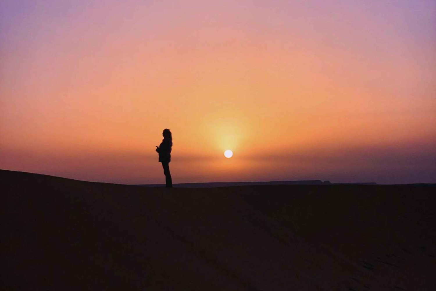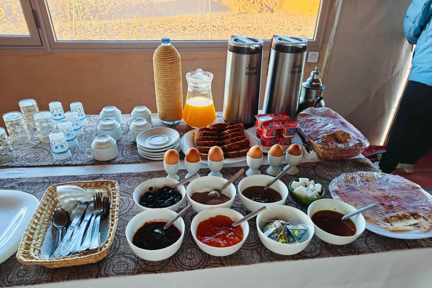 1日目: メルズーガの集合場所(安全な駐車場をご用意しております)から旅が始まります。そこから4WD車でラクダ乗り場までお迎えに上がります。お荷物はジープにてキャンプ地へ運ばれます。現地ガイドと合流後、エルグ・シェビの黄金の砂丘をラクダで横断するトレッキングを開始いたします。ラクダの背で優しく揺られながら、目の前に広がる広大な波打つ砂丘は、畏敬の念と静寂感をもたらします。ラクダ隊列のリズミカルな歩みは、日常の喧騒から離れた世界へと皆様をお連れいたします。 夕日が砂漠に温かな光を投げかける頃、人里離れた砂漠のキャンプに到着します。砂丘に抱かれたベルベル様式のテントは暖房完備で、伝統的な装飾と現代的な快適さが調和した居心地の良い空間です。砂漠の空が眩いばかりの星々のショーへと変わる中、心ゆくまでくつろぎ、リラックスしてください。これほど澄み渡り息をのむような光景は、おそらく生涯で最も印象深いものとなるでしょう。 星空の下で提供される美味しいモロッコ料理の夕食をお楽しみください。風味豊かなタジン料理、新鮮なサラダ、温かいパンが並びます。食後はキャンプファイヤーを囲み、伝統的な音楽と物語の夕べを。地元のベルベル人ミュージシャンが歌とリズムで文化を共有します。 2日目: 早朝に砂漠の日の出をご覧いただけます。砂丘が淡いピンクとオレンジ色に染まる、まさに魔法のような瞬間です。充実した朝食の後、ラクダまたは4WD車に乗り、駐車場まで穏やかな帰路につきます。ここで砂漠の冒険は幕を閉じます。Includes