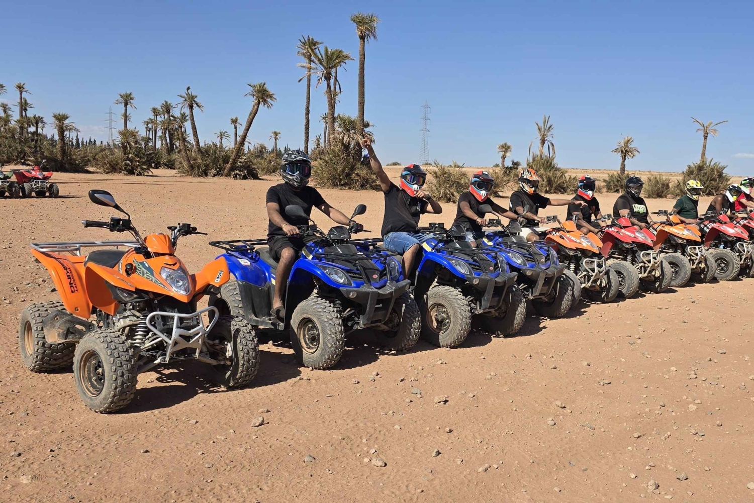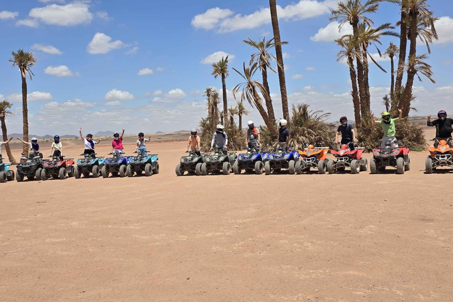 Ervaar de ultieme mix van spanning en traditie met de Quad Bike & Kamelenrit in Palmeraie bij Marrakech, Marokko. Begin je avontuur door de controle te nemen over een krachtige quad, terwijl je begint aan een off-road expeditie door de fascinerende woestijnlandschappen. Begeleid door deskundige instructeurs doorkruis je zanderige paden, onverharde wegen en open plekken, en geniet je van de opwinding en bevrijding die quadrijden met zich meebrengt. Als je eenmaal de adrenalinekick van het quadrijden hebt geabsorbeerd, is het tijd voor een rustiger tempo en dompel je onder in de authentieke charme van het kamelenrijden. Maak kennis met je beminnelijke kameelgenoten en bestijg, met de hulp van ervaren begeleiders, je kameel voor een ontspannen tocht van een uur door de palmbossen en vergezichten van de woestijn. Terwijl je harmonieus met de tred van je kameel mee deint, grijp je de kans om tot rust te komen en te genieten van de vredige schoonheid die je omringt. Tijdens de hele ervaring word je vergezeld door deskundige gidsen die boeiende inzichten delen over de plaatselijke cultuur, geschiedenis en omgeving, waardoor je de regio beter leert kennen. Deze kenmerkende combinatie van quad rijden en kamelenritten staat garant voor een onvergetelijk en afwisselend avontuur, dat tegemoet komt aan de voorkeuren van alle soorten reizigers. Of je nu hunkert naar een adrenalineverhogende escapade of een diepe duik in de culturele onderdompeling, de Quad Bike & Kamelenrit in Palmeraie levert de perfecte mix van opwinding, natuurlijke pracht en traditionele allure en zorgt voor blijvende herinneringen aan je tijd in Marrakech.Includes