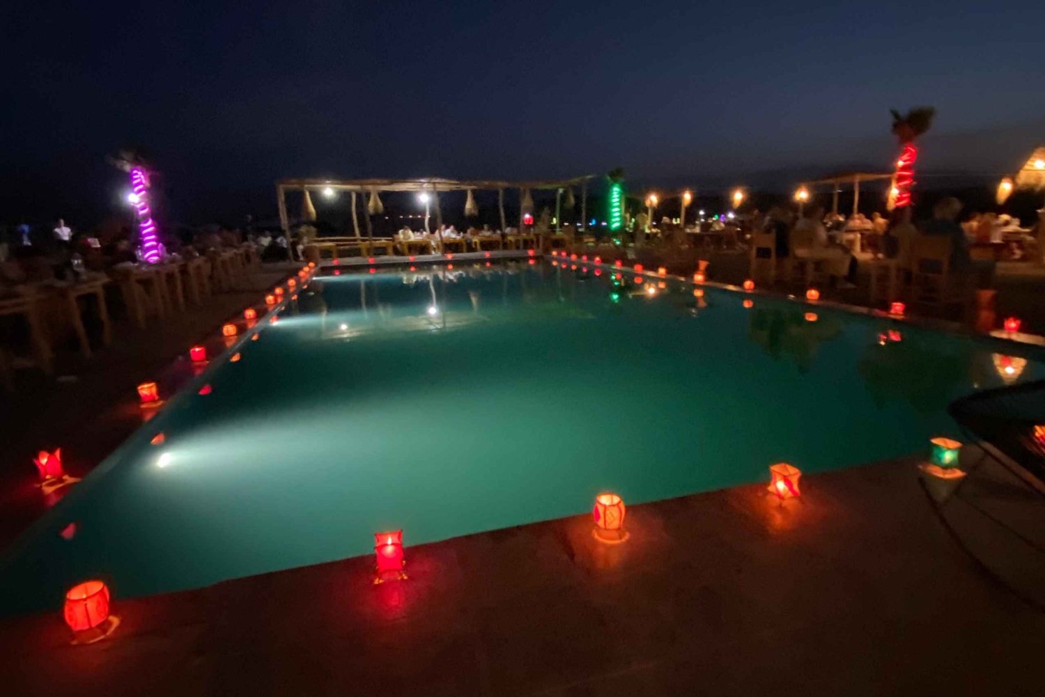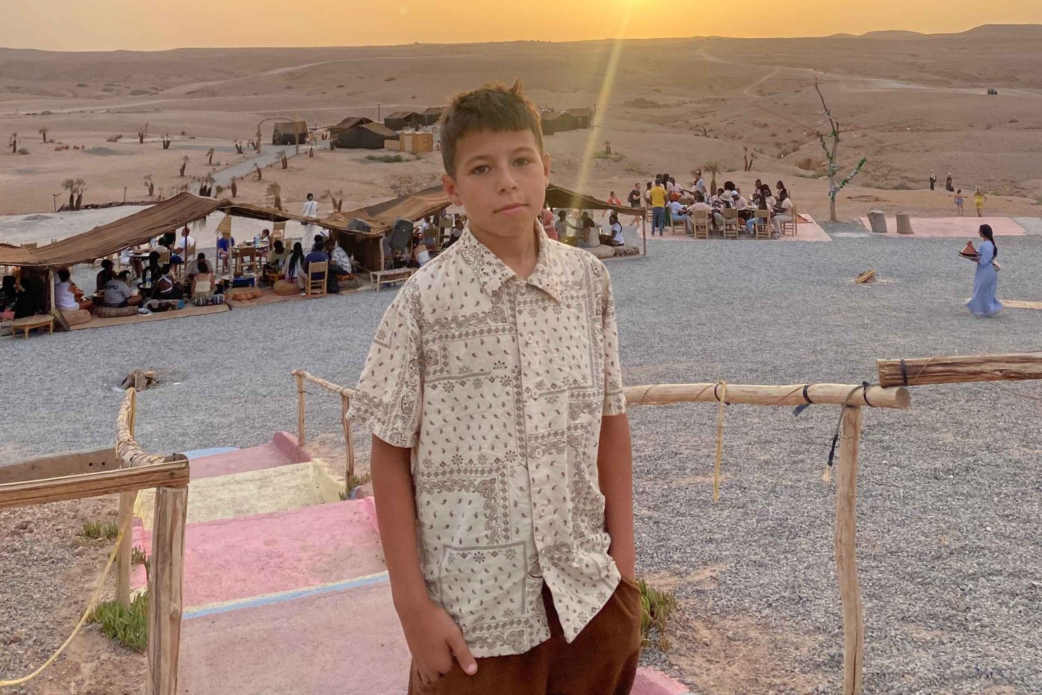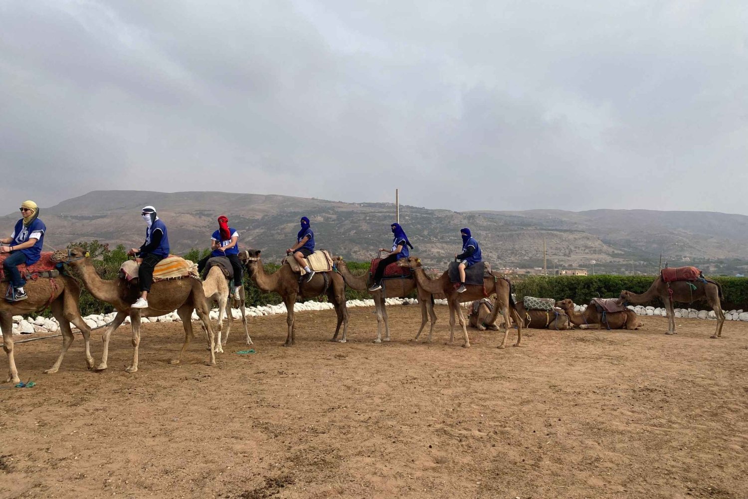 **Woestijnavontuur met quadrijden, kamelenrit bij zonsondergang, diner en folkloreshow** Ontsnap aan de stad en duik in de magie van de Agafay-woestijn tijdens een onvergetelijk avontuur vanuit Marrakech. Je reis begint met een schilderachtige rit van 40 minuten, waarbij je onderweg stopt voor traditionele muntthee en een bezoek aan een coöperatie van vrouwen die arganolie maken. Eenmaal in de woestijn maak je je klaar voor een spannende quadrit door ruig terrein en uitgestrekte, open landschappen. Voel de sensatie terwijl je over rotsachtige paden rijdt en de adembenemende omgeving bewondert. Na de rit geniet je van een rustige kamelenrit tijdens het gouden uur, terwijl de zon ondergaat boven de woestijn en de lucht in levendige kleuren schildert. Maak prachtige foto's en geniet van de rust van dit unieke landschap. Bij aankomst in een charmant woestijnkamp word je verwelkomd met Marokkaanse thee en zoetigheden, voordat je je klaarmaakt voor een magische avond. Dineer onder de sterren met een traditionele Marokkaanse maaltijd met tajines, couscous en lokale lekkernijen. De avond komt tot leven met livemuziek, buikdansen en een spectaculaire vuurshow, wat zorgt voor een onvergetelijk feest van de Marokkaanse cultuur. Deze complete woestijnervaring is perfect voor avonturiers, stellen, gezinnen en iedereen die op zoek is naar de sfeer van Marokko.Includes