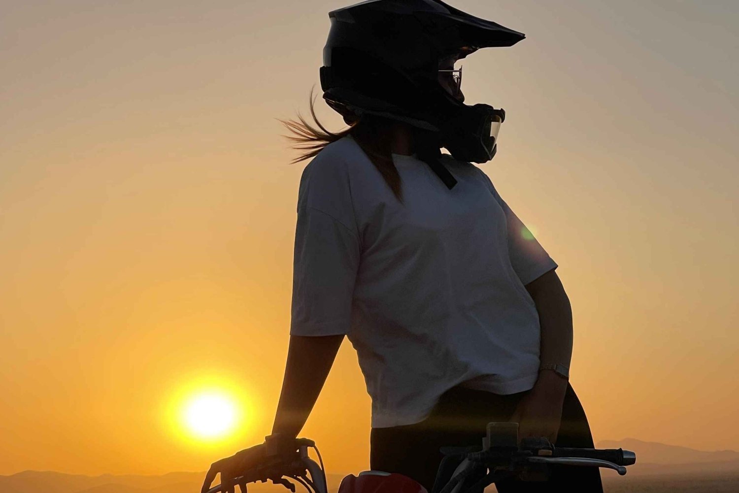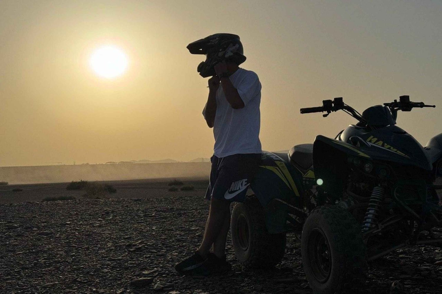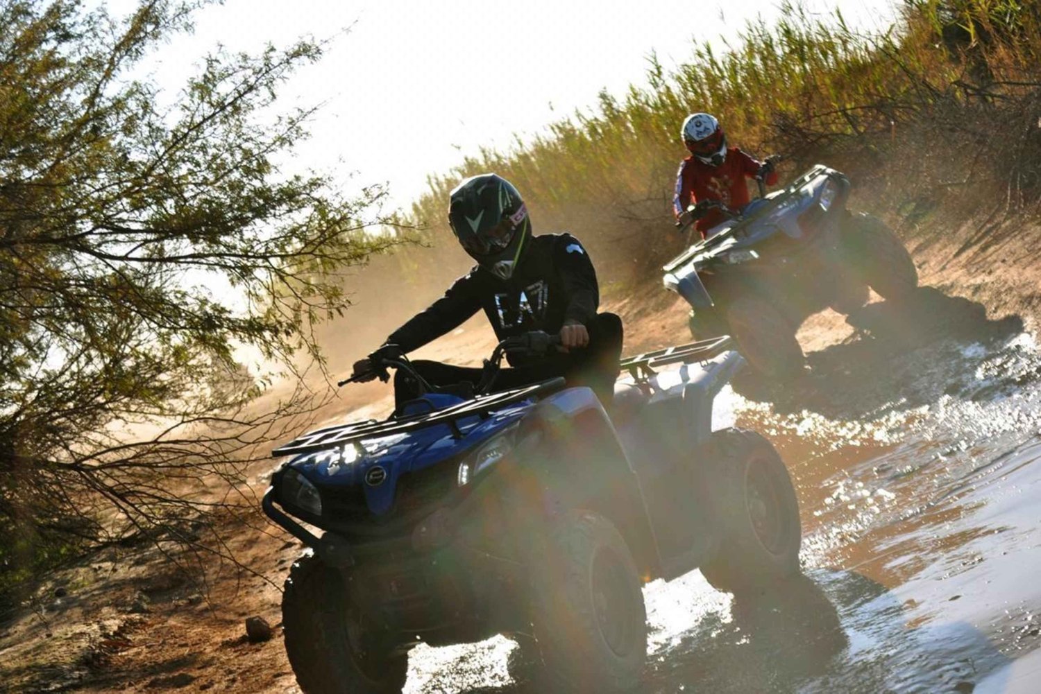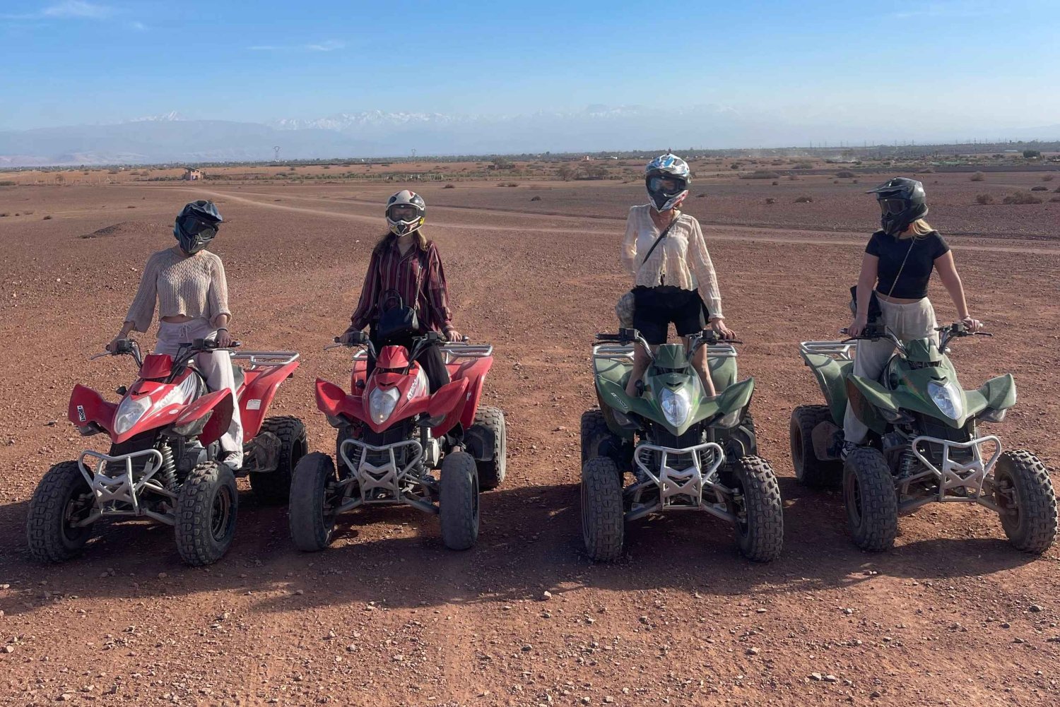 Firehjulingen fra Marrakech blir i økende grad brukt som et rekreasjonsmiddel på veiene i Marrakech. Dette er komfortable og pålitelige maskiner som kan kjøre hvor som helst. Sand, gjørme, elver i og rundt Marrakech... det finnes ingen hindringer de ikke kan overvinne! Følg alltid sikkerhetsinstruksjonene og informasjonen i guiden vår, så tror jeg du vil forstå hvorfor. Våre firehjulinger står til tjeneste for et touring-eventyr i Marrakech. Kjør firehjulingen gjennom denne overraskende steinørkenen, forbi de svarte fjellene i 'Jbiletes' og de fortsatt ville palmelundene. Du besøker også autentiske berberlandsbyer der du vil bli overrasket over lokalbefolkningens velkomst og gjestfrihet. Å sykle på firehjuling i Palmeraie de Marrakech er den beste måten å oppdage Marrakech-ørkenen på, der du passerer gjennom berberlandsbyer og palmeoaser mens du nyter panoramautsikten over de snødekte Atlasfjellene.Includes