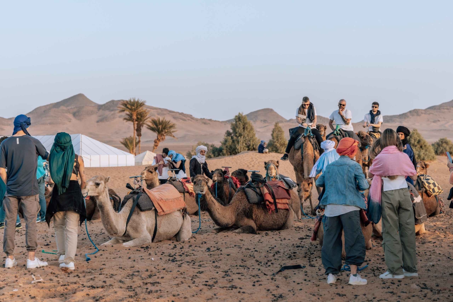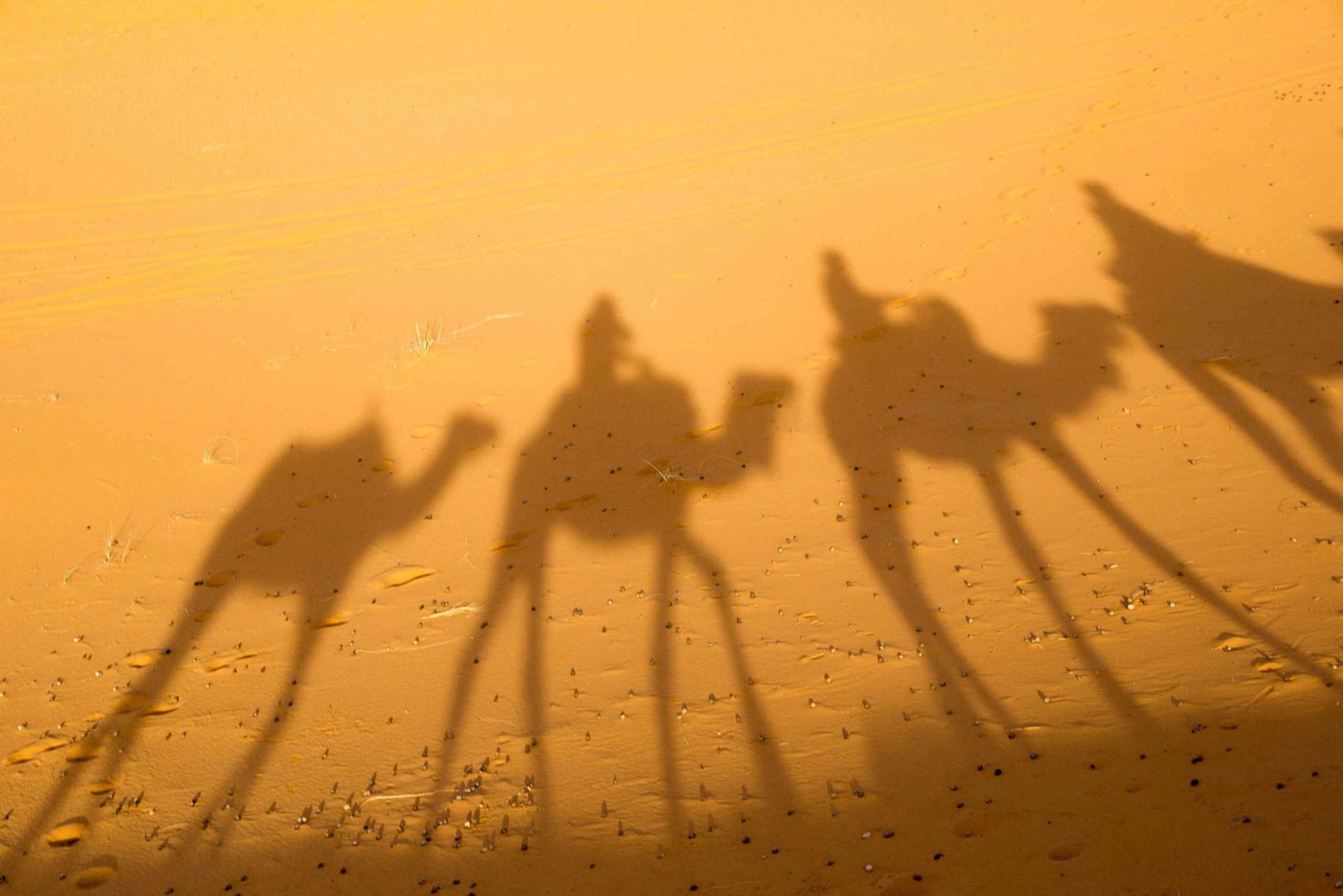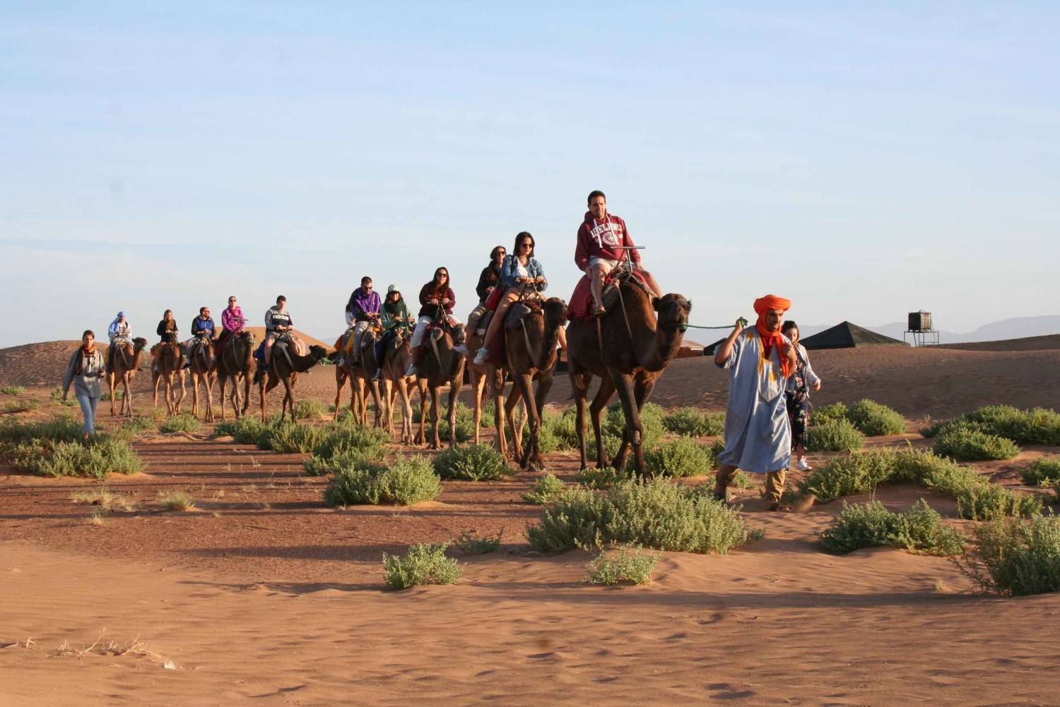 Dag 1: Kasbah Ait Ben Haddou - Draa-dalen - Zagora Etter å ha blitt hentet i Marrakech, setter vi kursen mot Zagora. Første stopp er Kasbah Ait Ben Haddou. Oppdag denne imponerende landsbyen som står på UNESCOs verdensarvliste, en befestet landsby der det i dag bare er fem familier igjen. Deretter setter du kursen mot Draa-dalen, der du kan beundre endeløse ksour (befestede stammelandsbyer) og kasbaer (befestede hjem for stammeherskere). På slutten av dagen kommer du til Zagora, hvor du kan se solnedgangen på en times kameltur. Avslutt med en utmerket middag på en ørkencamp Dunes in the Zagora luxury desert camp & private toilet and shower! Stå opp tidlig for å nyte den magiske soloppgangen i sanddynene før du setter deg ned til frokost. Ta en kamelritt tilbake til startpunktet for å begynne reisen tilbake til Marrakesh. Gjør et stopp i Ouarzazate, også kjent som ørkenens dør, for å se Kasbah Taourirt, et citadell med Atlasfjellene som bakgrunn, før dere blir satt av i Marrakech.Includes