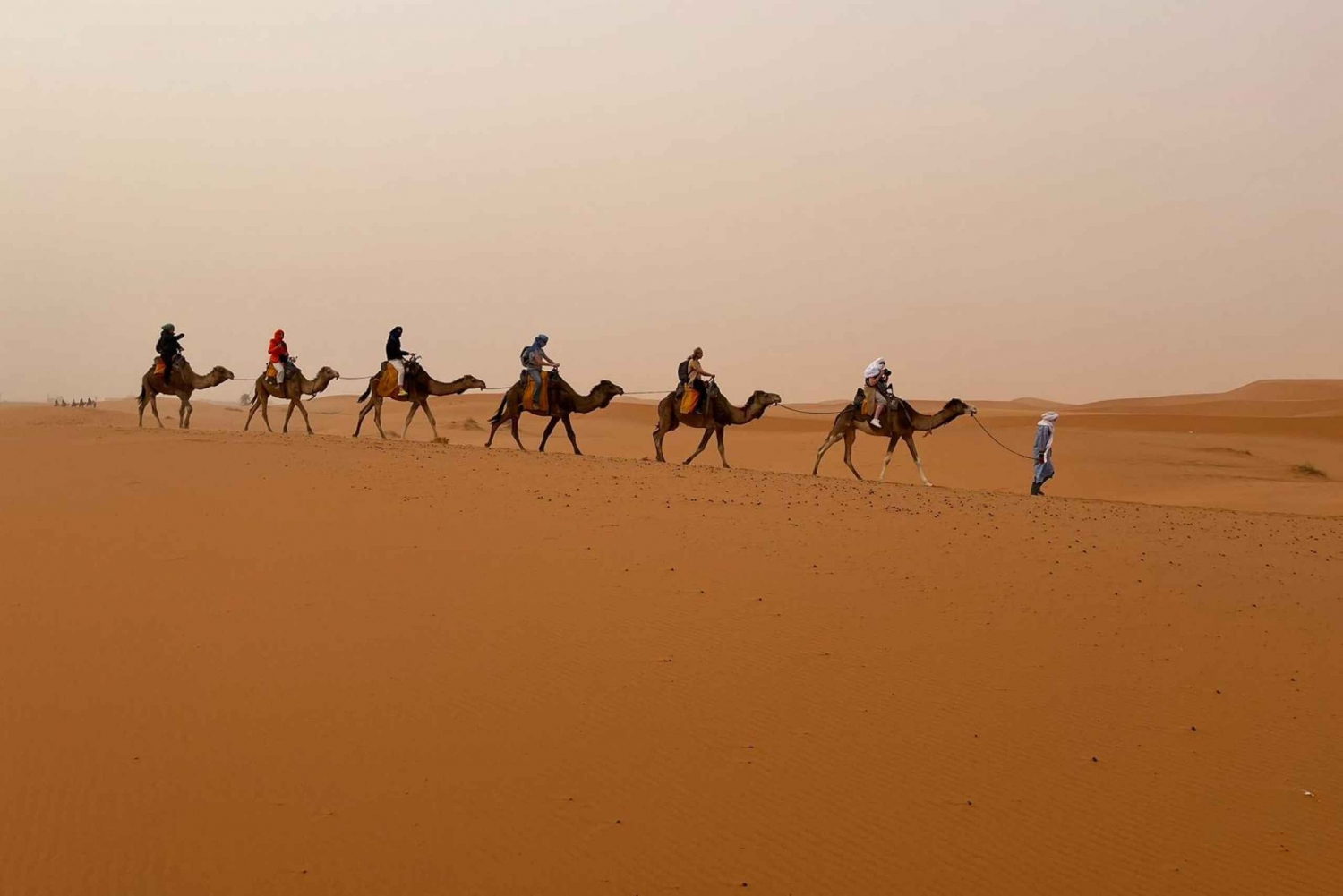Legg ut på en fascinerende 3-dagers ørkenreise fra Marrakech til Agadir via den fortryllende Merzouga-ørkenen. Utforsk de majestetiske Atlasfjellene, besøk eldgamle kasbahs og opplev Marokkos fantastiske landskap. Vi rir på kamel, overnatter på camping i Sahara og fordyper oss i den levende kulturen underveis. Reiseplan: Dag 1: Marrakech - Atlasfjellene - Ait Ben Haddou - Ouarzazate - Dades Town Start eventyret med å krysse Atlasfjellene, oppdage berberlandsbyer og besøke den berømte kasbahen Ait Ben Haddou. Utforsk den filmatiske byen Ouarzazate og Taourirt Kasbah. Reis videre gjennom Skoura og Rosedalen før du overnatter i Dades Town. Dag 2: Boumalne Dades - Todra-juvet - Erfoud - Merzouga Opplev de fantastiske Toudra-juvene med sine ruvende fjellvegger, og fortsett til Erfoud. I Merzouga kommer du til de fascinerende Erg Chebbi-sanddynene, der du kan ri på kamel mens du ser solnedgangen over Sahara. Overnatter i en tradisjonell nomadeleir og nyter trommespill og den magiske ørkenatmosfæren. Dag 3: Merzouga - Rosendalen - Ouarzazate - Agadir Vi våkner til en fascinerende soloppgang over sanddynene før vi drar tilbake til Auberge. Vi reiser gjennom den naturskjønne Draadalen, som er full av berberkasbahs. Kjør gjennom Taznakht og Taliouine på vei til Agadir, der turen avsluttes. Transfer til stedet eller overnattingsstedet du har valgt. Avslutt reisen med uforglemmelige minner fra Atlasfjellene, de gamle kasbahene, Sahara-ørkenen og Marokkos varme gjestfrihet. Enten du blir sluppet av på hotellet eller et sentralt sted, har du mulighet til å utforske mer av Agadirs livlige tilbud. Bestill nå, og legg ut på et oppslukende eventyr gjennom Marokkos mangfoldige landskap og kulturskatter.Includes