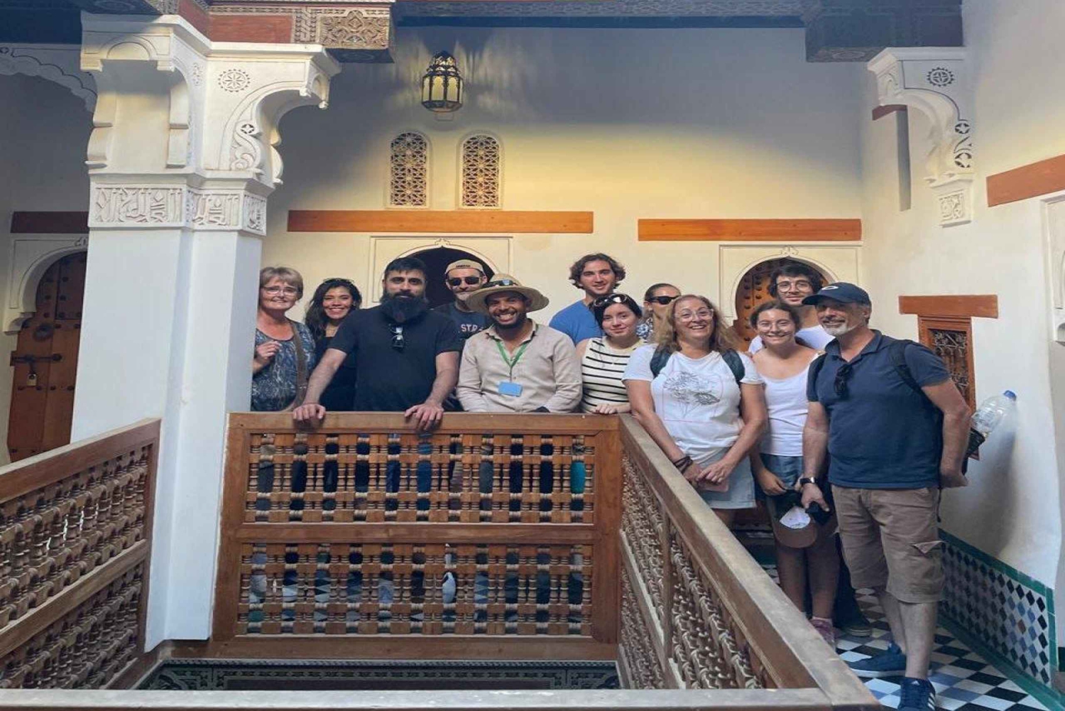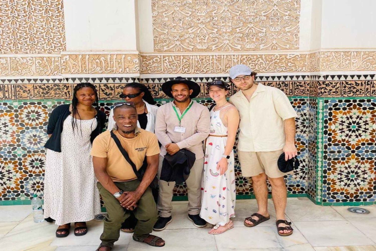 Møt den lokale guiden din foran Café Argana ved Jemaa el-Fna, hvor du får en kort oversikt over turen og viktige tips. Vær oppmerksom på at inngangsbilletter til historiske monumenter ikke er inkludert i turprisen og må betales i marokkanske dirham (MAD). Begynn reisen gjennom Marrakech' middelalderske medina, der historien blir levende i hver eneste bakgate. Spaser gjennom det travle Jemaa el-Fna-torget, og begi deg deretter inn i byens skjulte håndverkskvarterer. Bli vitne til flere hundre år gammelt håndverk, fra håndvevde tekstiler til tradisjonell marokkansk keramikk, mens du navigerer gjennom labyrinten av souker som bugner av autentiske kulturskatter. Gå forbi en av de eldste hammamene i Marrakech, og oppdag den hellige marokkanske tradisjonen med hammam og dampbad, som har vært en viktig del av den lokale kulturen i århundrer. Deretter kan du fordype deg i det livlige Kryddertorget, der aromatiske krydder, urtemedisiner og naturlige parfymer fyller luften. Guiden din vil introdusere deg til den rike arven av marokkanske krydder og tradisjonelle remedier, og avsløre deres historiske betydning og daglige bruk. Avdekk hemmelighetene bak et eldgammelt vannhåndteringssystem, et genialt ingeniørarbeid som har holdt liv i medinaen i Marrakech i generasjoner. Mens du går på oppdagelsesferd, kan du gå inn i en skjult perle - en utsøkt islamsk hage utformet med symbolsk geometri, frodige grøntområder og rolige fontener. Dette fredelige tilfluktsstedet gjenspeiler den harmoniske balansen mellom natur og arkitektur som man finner i tradisjonell marokkansk design. Til slutt kan du dykke ned i de historiske underverkene i Ben Youssef Madrasa, et av Marrakechs mest ikoniske landemerker. Her kan du beundre de intrikate mosaikkene, det utskårne sedertreverket og stukkaturarbeidene, som viser den islamske arkitekturens glans. Gå gjennom studentkamrene og fellesområdene, der de lærde en gang samlet seg for å studere Koranen og islamske vitenskaper. Guiden din vil vekke denne historiske koranskolen til live og gi deg innsikt i Marokkos rike utdannings- og kulturarv. Denne oppslukende vandringen blander historie, arkitektur og lokal kultur, og gir et uforglemmelig innblikk i Marrakechs livlige fortid og nåtid.Includes