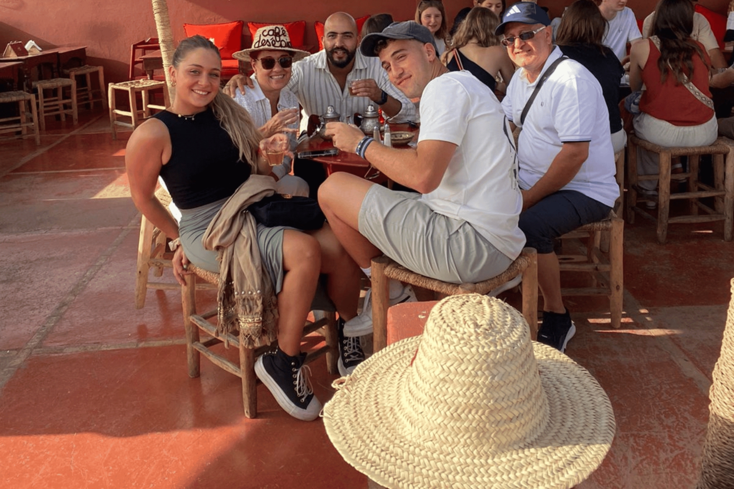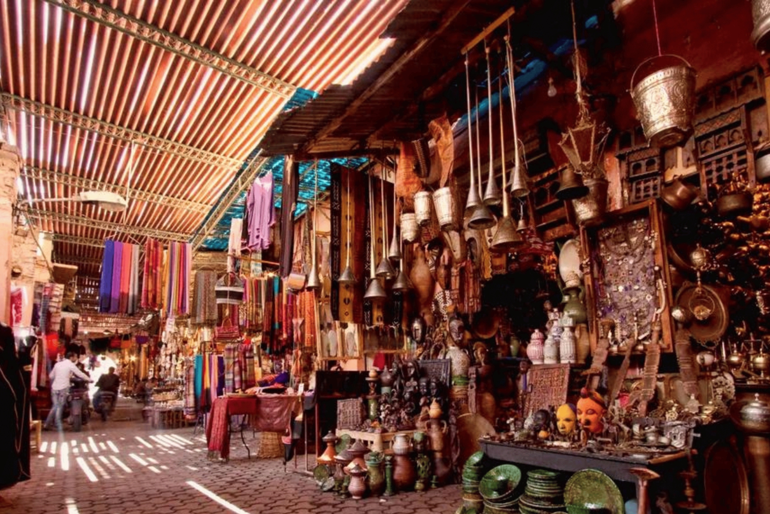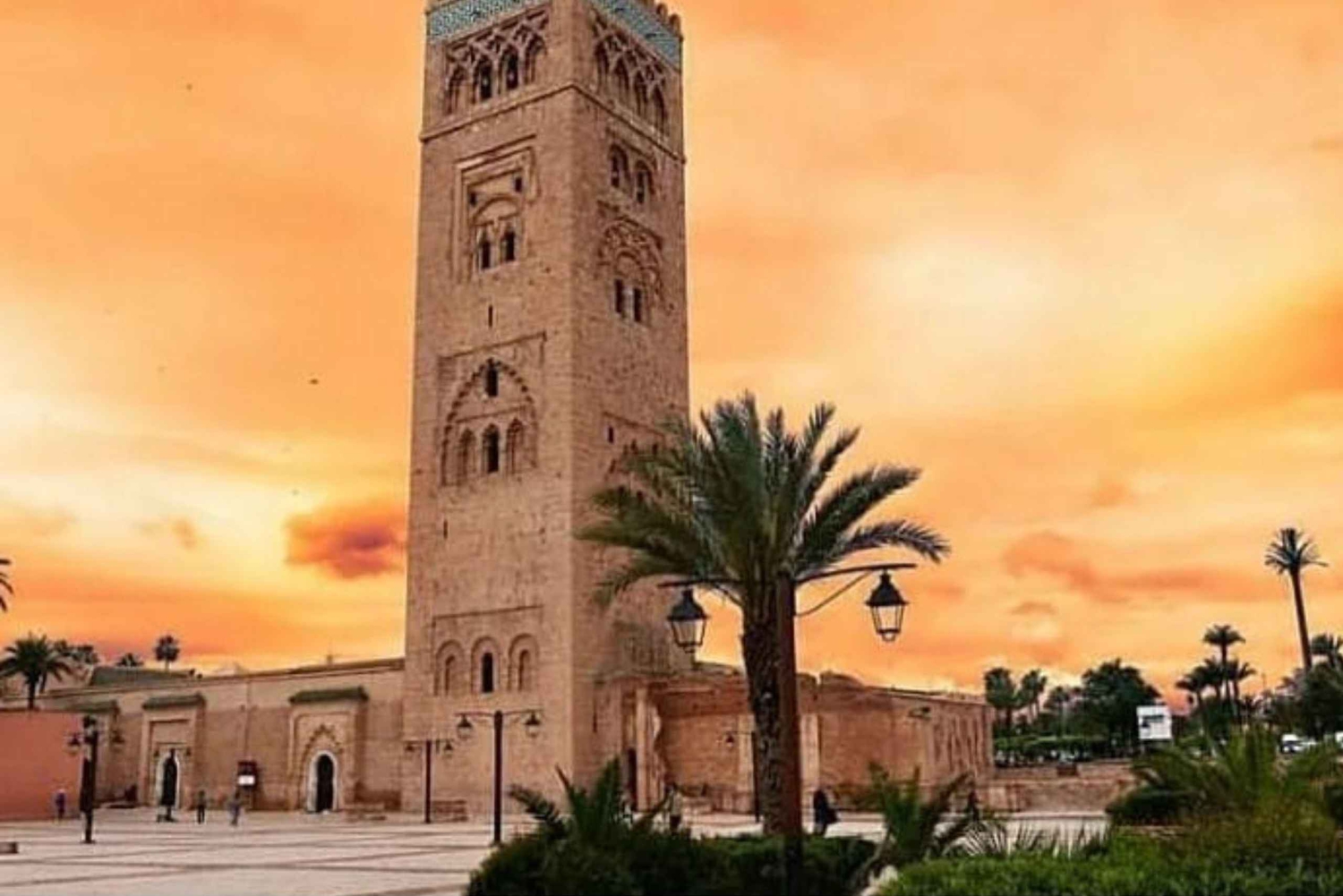 Turen til Marrakech begynner med en praktisk henting fra hotellet eller et annet møtested, spesielt hvis riaden din er utilgjengelig med bil. Dette sikrer en sømløs start på utforskningen av byens rike kultur og livlige atmosfære. Deretter tilbringer du en time med å vandre gjennom den fortryllende gamle medinaen, der de trange gatene er kantet av fantastisk arkitektur og historiske landemerker. Her får du muligheten til å fordype deg i den lokale kulturen og oppdage skjulte perler rundt hvert hjørne. Etter besøket i medinaen kan du slappe av i 30 minutter med en forfriskende drink på Café des Épices. Taket er det perfekte utsiktspunktet for å nyte de livlige omgivelsene og ta inn synet og lyden av den travle markedsplassen nedenfor. Eventyret fortsetter med en time i souken, der du kan kikke på en rekke lokale håndverksprodukter, krydder og tekstiler. Ta kontakt med lokale håndverkere og opplev den livlige forhandlingskulturen som preger dette shoppingparadiset. Etter souken kan du tilbringe ytterligere 30 minutter på taket av Café de France. Her kan du slappe av og nyte panoramautsikten over det ikoniske Jemaa el-Fna-torget, det perfekte bakteppet for avslapning. Deretter har du 30 minutter på egen hånd til å utforske Jemaa el-Fna på egen hånd. Ta del i de livlige forestillingene og sug til deg den pulserende atmosfæren på dette berømte torget. Avslutt dagen med en deilig middag på et gjestehus på taket i medinaen. I halvannen time kan du nyte tradisjonell marokkansk mat mens du nyter den fantastiske utsikten over byen mens kvelden senker seg. Denne uforglemmelige opplevelsen fanger essensen av Marrakech og vil gi deg varige minner. Ta deg tid til å kjøle deg ned med forfriskende brus mens du observerer dagliglivet til de forbipasserende fra den store takterrassen.Includes