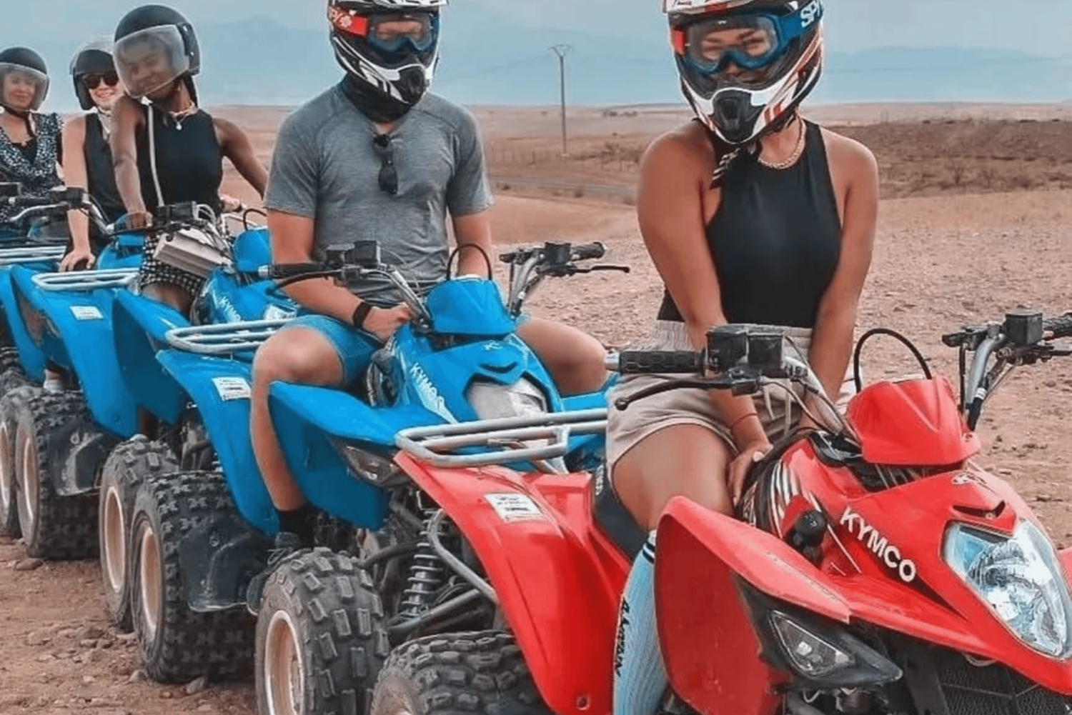 Legg ut på et uforglemmelig eventyr i Agafay-ørkenen med vår all-inclusive-pakke. Vi henter deg på hotellet eller riaden din i luftkondisjonerte og komfortable omgivelser, slik at du får en problemfri start på reisen. Deretter kan du fordype deg i ørkenens skjønnhet med en fascinerende tur på firhjuling eller en 30-minutters kameltur og en times tur på firhjuling, ikledd en tradisjonell blå Touareg-kjole. Når dagen går over i kveld, kan du nyte en herlig middag som serveres under et nomadisk telt, med tagine med grønnsaker og kylling, supplert med en frisk salat og frukt. Hold deg forfrisket med marokkansk te og mineralvann, og underholdningen stopper ikke der! Bli vitne til fengslende opptredener av en marokkansk folkloregruppe, magedansere og en fascinerende ildsluker ved leirbålet. Opplev magien i Agafay-ørkenen sammen med oss, og skap minner som vil vare livet ut.'Includes