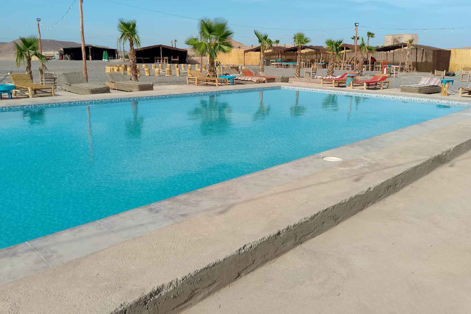 Det skal være sikkert og visst! Om ettermiddagen, fra kl. 14.30, kommer vi og henter deg på hotellet ditt i Marrakech for å ta deg med på det spennende ørkeneventyret i Agafay. Når vi ankommer og ser det imponerende landskapet, begir vi oss ut på en unik reise på ridetur på kameler og firehjulinger over ørkensanddynene. Senere slapper vi av ved et paradisisk basseng. Når solen går ned, kan du glede deg til en fengslende gitaropptreden ved leirbålet. Når det er showtime, samles vi på en restaurant med levende lys, en sjarmerende hytte, og nyter en herlig middag bestående av autentiske marokkanske retter som salater, tagine, couscous og dessert. Alt dette akkompagneres av levende musikk, inkludert gnawa, dansere, ildjonglører og en magedanser - alle oppfordres til å bli med på moroa. Etter denne fantastiske og uforglemmelige kvelden vender vi tilbake rundt kl. 22.30. Barn under 12 år kan få ridetur på firehjuling og kamel i følge med en forelder.Includes