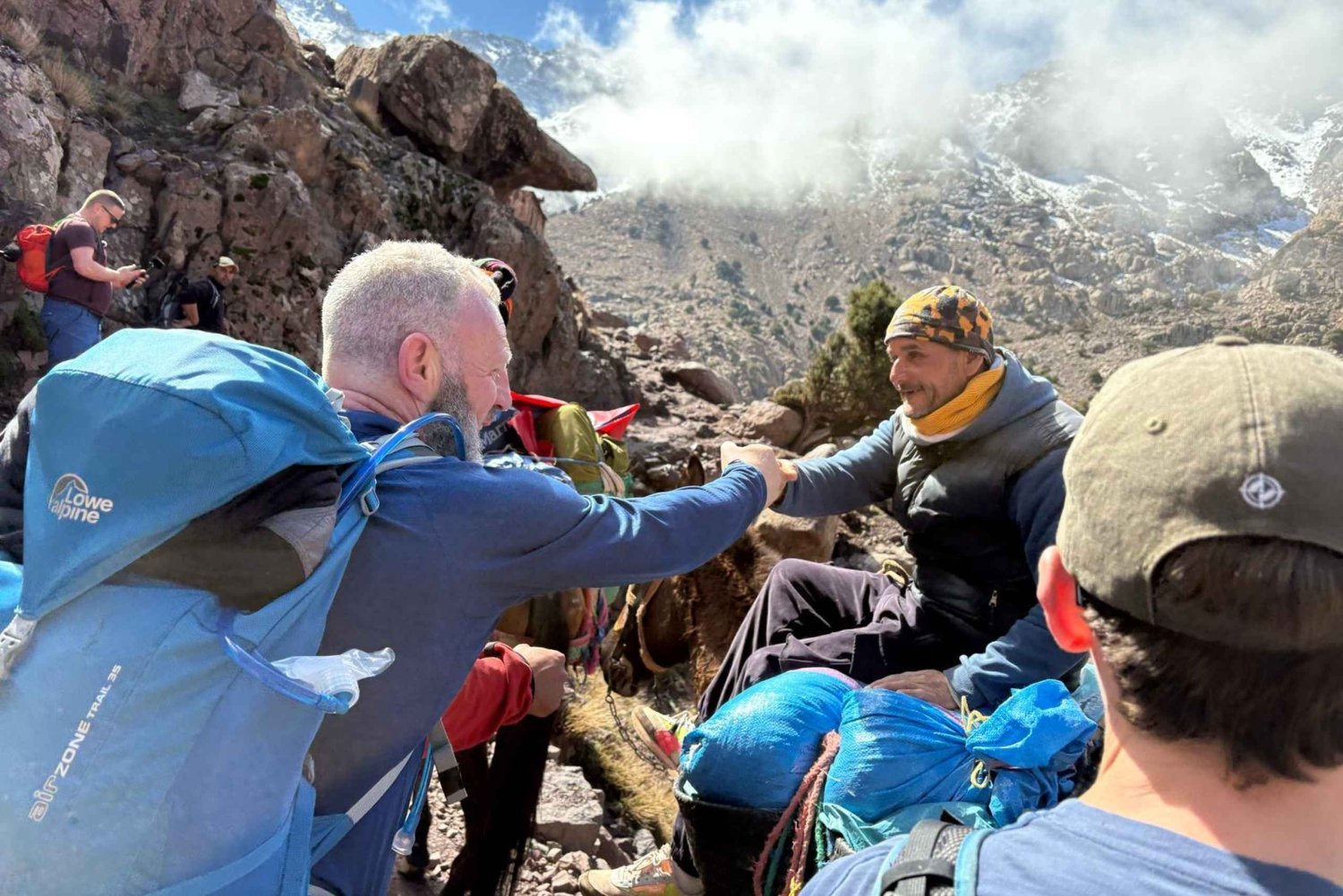 Dag 1: Marrakech - Toubkal Refuge Møt opp på Hotel Ali Cafe i Marrakech eller på overnattingsstedet ditt. Du møter den erfarne guiden og teamet ditt før du legger ut på en utfordrende, men givende fottur. Dere går opp gjennom et fantastisk fjellandskap og tar en lunsjpause før dere når Toubkal Refuge på 3200 meters høyde. Her venter en solid middag og overnatting i felles sovesal. Dag 2: Toppen av Toubkal - Imlil - Marrakech Stå tidlig opp for å erobre toppen av Toubkal, Nord-Afrikas høyeste topp. Med hjelp av guiden din tar du deg gjennom et fantastisk terreng. Etter å ha nådd toppen og beundret panoramautsikten, går dere ned til tilfluktsstedet og spiser lunsj. Fortsett turen tilbake til Imlil, hvor transporten venter. Mulighet for tilvalg: Forleng oppholdet i Imlil med en ekstra natt for å komme dere helt til hektene før dere returnerer til Marrakech.Includes