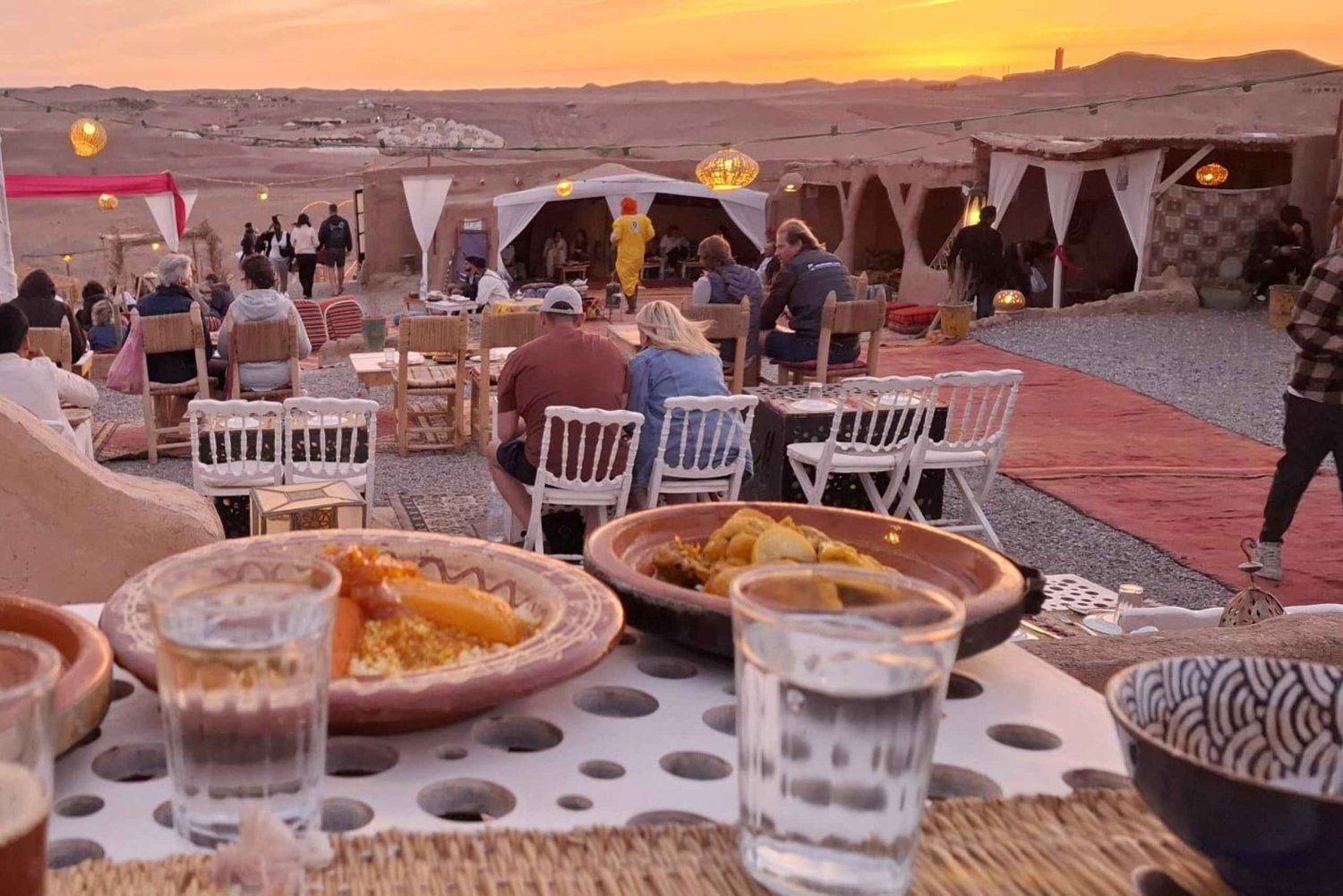 Chcesz spędzić wyjątkową noc podczas podróży do Marrakeszu? Dzięki temu doświadczeniu na pustyni Agafay będziesz spać w haimie pod gwiazdami i podziwiać spektakularny wschód słońca nad wydmami. To będzie magiczne! Pamiętaj, że rezerwacja jest równoważna z pokojem jednoosobowym o maksymalnej pojemności 4 osób na pokój (jeśli zdecydujesz się na pobyt w prywatnym namiocie). Pamiętaj, że oferujemy 2 rodzaje zakwaterowania: nocleg w prywatnym namiocie i nocleg we wspólnym namiocie (dormitorium). Upewnij się, że podczas rezerwacji wybierzesz opcję, która najbardziej Ci odpowiada.Includes