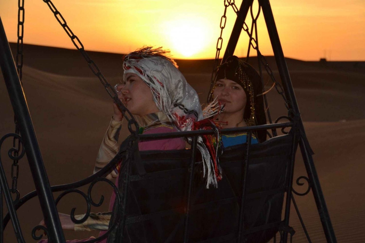 Wyrusz na hipnotyzującą 3-dniową wycieczkę po Saharze z Fezu do Marrakeszu przez Merzougę, zanurzając się w autentycznej marokańskiej Saharze z niezapomnianą nocą pod zapierającym dech w piersiach gwiaździstym niebem, obozem berberyjskim i ekscytującymi wędrówkami na wielbłądach. **Dzień 1: Fez - Ifrane - Azrou - Midelt - Merzouga** Twoja przygoda rozpocznie się, gdy prywatny kierowca odbierze Cię z riadu lub hotelu o 7:30 rano. Przygotuj się na zaczarowaną podróż w kierunku jednego z najbardziej magicznych miejsc w Maroku - Merzouga i wydm Erg Chebbi. Przemierz góry Atlasu Średniego, przechodząc przez malowniczy las cedrowy Ifrane, często nazywany 'Szwajcarią Maroka'. Po drodze zatrzymamy się w Azrou, Midelt i oszałamiającej dolinie Ziz. W miarę upływu dnia dotrzemy do Merzouga, gdzie spędzisz noc w hotelu lub riadzie, delektując się pyszną kolacją. **Dzień 2: Z Merzouga do Ouarzazate** Wstań wcześnie, aby zobaczyć spektakularny wschód słońca nad pustynią Sahara. Następnie wyrusz na wielbłądzie z powrotem do miejsca zakwaterowania w Merzouga. Po obfitym śniadaniu i orzeźwiającej przerwie rozpoczniemy naszą podróż w kierunku Ouarzazate. Po drodze zatrzymamy się na lunch (nie wliczony w cenę) przed dotarciem do Ouarzazate, gdzie zostaniesz przewieziony do hotelu lub riadu. Spędź wieczór relaksując się i delektując kolacją w miejscu zakwaterowania w Ouarzazate. **Dzień 3: Ouarzazate - Ait Ben Haddou - Tizi-n-Tichka - Marrakesz**. Po śniadaniu nasz dzień rozpocznie się od wizyty w słynnym Atlas Film Studios, oferującym fascynujące spojrzenie na świat kina. Następnie udamy się do historycznej wioski Aït Benhaddou, obiektu z listy UNESCO, słynącego z kultowej Kasbah położonej na szczycie wzgórza z widokiem na malowniczą rzekę Ounila. Podziwiaj architekturę Kasbah i poznaj jej bogatą historię, w tym rolę, jaką odegrała jako miejsce kręcenia wielu hitów filmowych. Kontynuując naszą podróż, zatrzymamy się w Telouet na lunch i relaks przed zwiedzaniem wspaniałej Kasbah of Telouet. Przejeżdżając przez przełęcz Tizi-n-Tichka na wysokości 2260 m n.p.m., przygotuj się na panoramiczne widoki na góry Atlas usiane tradycyjnymi berberyjskimi wioskami. Na koniec dotrzemy do Marrakeszu, gdzie nasza niezapomniana wycieczka po Saharze zakończy się odbiorem w Twoim hotelu lub riadzie. Wyrusz na tę wciągającą 3-dniową wycieczkę po Saharze i doświadcz magii pustynnych krajobrazów Maroka, starożytnego dziedzictwa i ciepłej gościnności.Includes