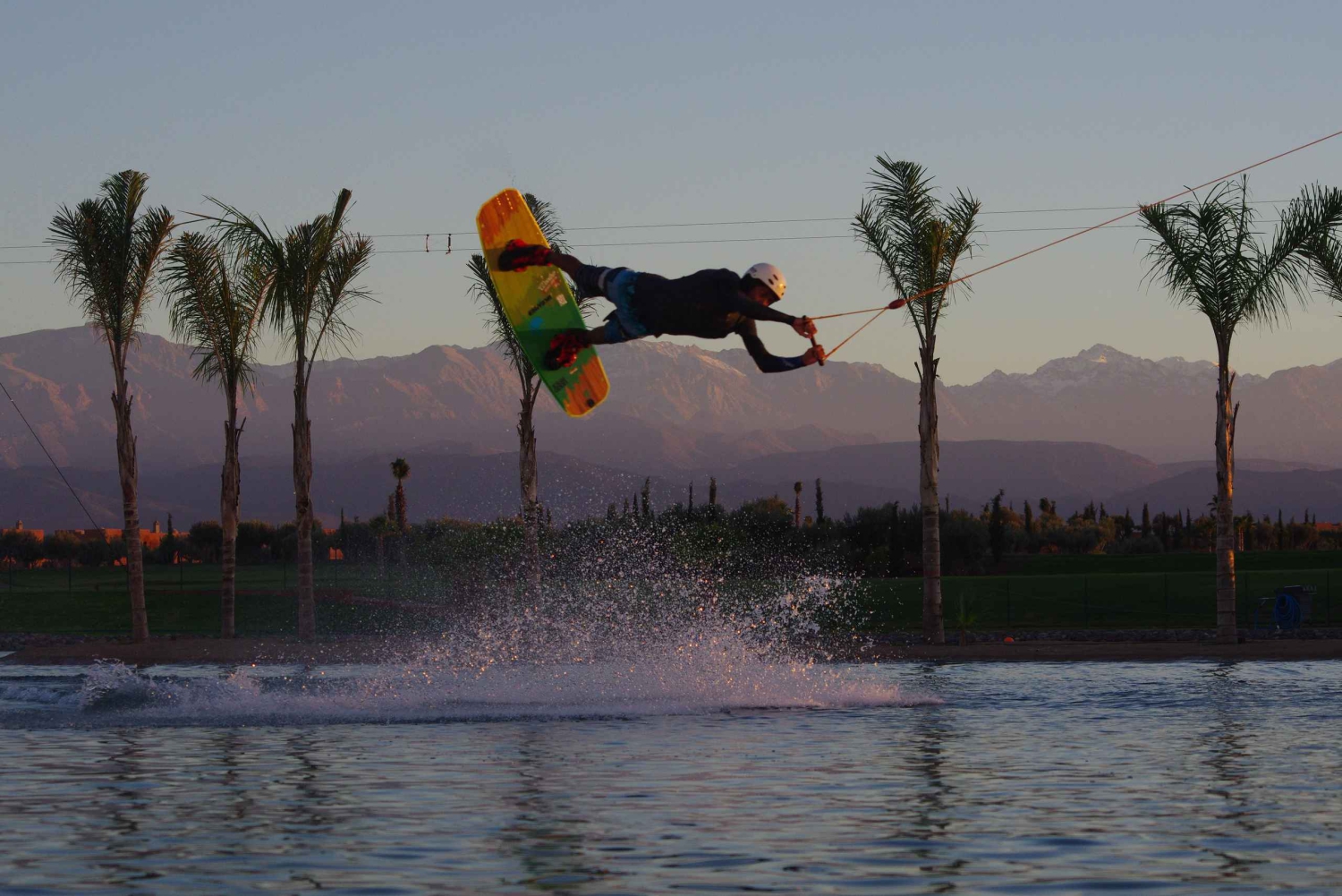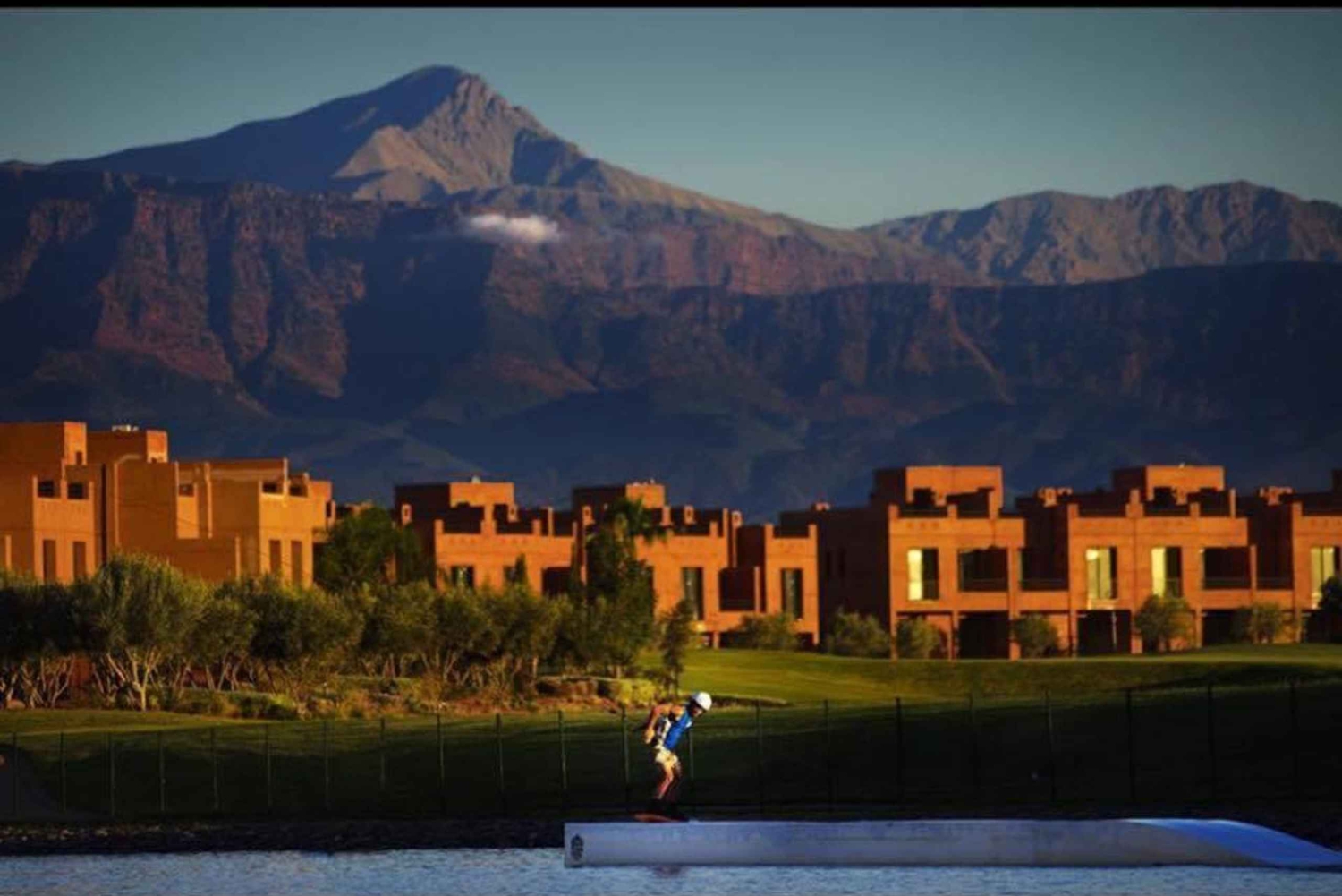 Po przyjeździe przedstawimy Ci wstęp do parku, odprawę dotyczącą bezpieczeństwa, a cały sprzęt zostanie dostarczony na półtoragodzinną sesję. Nauczymy Cię również techniki wstawania na wakeboardzie i dłuższej jazdy po jeziorze za liną. W Marrakeszu panuje ciepły i suchy klimat, co oznacza, że jezioro jest spokojne i idealne do wakeboardingu, niezależnie od Twoich umiejętności lub wcześniejszego doświadczenia. Park linowy do wakeboardingu w Marrakeszu to idealne miejsce na krótką 1-dniową wycieczkę z Marrakeszu; piękne jezioro z oszałamiającym widokiem na ośnieżone góry. Dołącz do nas w ten zabawny dzień poza Marrakeszem, a my zapewnimy, że spędzisz niezapomniany czas na wakeboardingu w parku linowym w Marrakeszu!Includes
