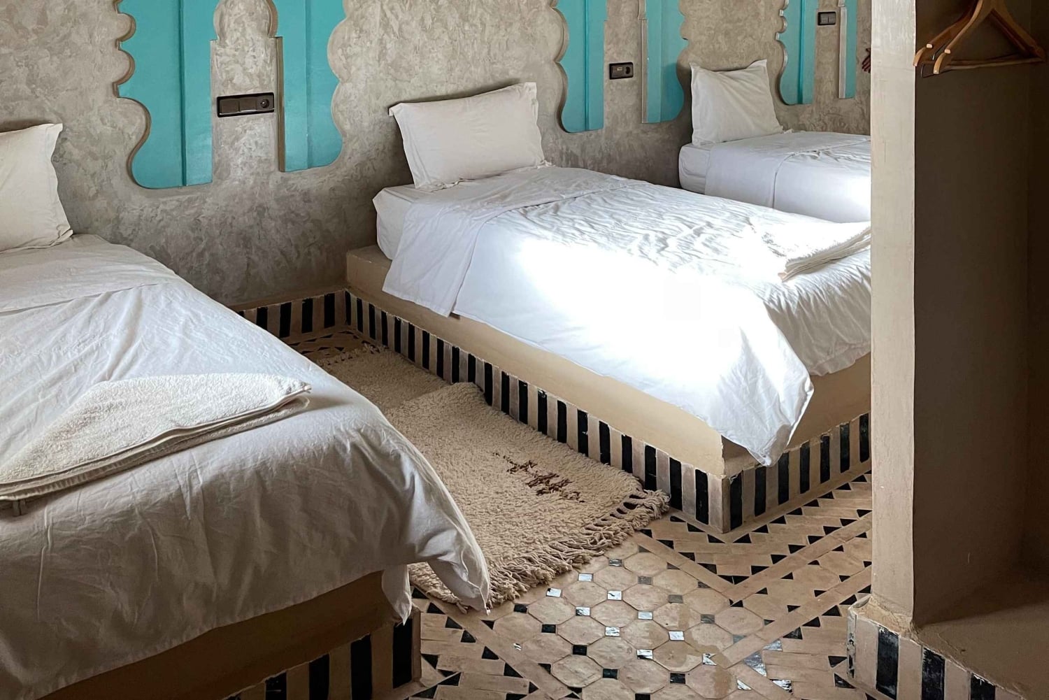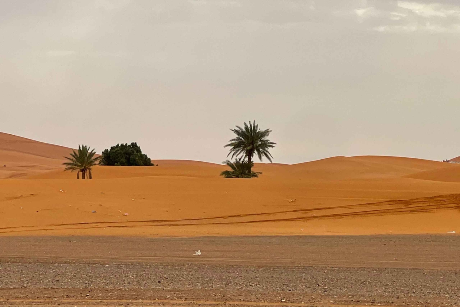 ✅Dzień 1: Marrakesz → Atlas Wysoki → Ajt Ben Haddu → Warzazat → Dolina Dadès. Twoja przygoda zaczyna się wcześnie rano, gdy wyjeżdżasz z Marrakeszu i przekraczasz spektakularne góry Wysokiego Atlasu przez krętą przełęcz Tizi n'Tichka. Podziwiaj panoramiczne widoki, zatrzymuj się na zdjęcia i zobacz tradycyjne berberyjskie wioski zbudowane na zboczach gór. Pierwszą główną atrakcją dnia jest Aït Benhaddou, miejsce z listy UNESCO. Ten ufortyfikowany ksar słynie ze swojej starożytnej architektury i jest tłem dla wielu filmów, w tym „Gladiatora” i „Gry o tron”. Po zwiedzeniu wąskich uliczek kasby jedź dalej do Ouarzazate, znanego jako „brama do pustyni”. Przejedź przez oazę Skoura i pachnącą Dolinę Róż. Po południu dotrzesz do oszałamiającej Doliny Dades, często nazywanej „Doliną Tysiąca Kasbah”. Zjedz pyszną kolację i zrelaksuj się w uroczym hotelu lub kasbah, otoczony spektakularnymi górskimi krajobrazami. ✅Dzień 2: Dolina Dades → Wąwóz Todra → Pustynia Merzouga → Luksusowy obóz. Po śniadaniu jedź Drogą Tysiąca Kasb, aż dotrzesz do imponującego wąwozu Todra – cudu natury z klifami o wysokości ponad 300 metrów. Wybierz się na spacer po wąwozie i zanurz się w jego pięknie, zanim pojedziesz do pustynnego miasta Erfoud, słynącego ze skamieniałości i tradycyjnych targów. Po południu dotrzesz do Merzougi, gdzie rozległe wydmy Erg Chebbi dramatycznie wznoszą się z pustynnego dna. Tam czeka na Ciebie karawana wielbłądów, która zabierze Cię na przejażdżkę po złotych piaskach, gdy słońce będzie zachodzić, tworząc zapierającą dech w piersiach paletę kolorów. Dotrzesz do luksusowego obozu na pustyni, gdzie Twój prywatny namiot oferuje idealne połączenie tradycyjnego stylu i nowoczesnego komfortu, wraz z prywatną łazienką i prysznicem. Po pysznej marokańskiej kolacji zrelaksujesz się przy ognisku pod gwiaździstym niebem, słuchając tradycyjnych berberyjskich rytmów granych przez lokalnych muzyków. ✅ Dzień 3: Luksusowy obóz → Merzouga → Dolina Ziz → Midelt → Ifrane → Fez. Wstań wcześnie, żeby zobaczyć wschód słońca nad wydmami i zrobić niezapomniane zdjęcia pustyni. Potem będziesz mieć czas na prysznic i śniadanie w luksusowym obozie, zanim wyruszysz w podróż do Fezu. Podczas wycieczki przejedziemy przez Erfoud, oszałamiającą dolinę Ziz i miasto Midelt, gdzie zatrzymamy się na lunch. Następnie pojedziemy do cedrowego lasu Azrou, gdzie możesz zobaczyć słynne makaki berberyjskie. Zanim dotrzemy do Fezu, odwiedzimy Ifrane, znane jako „Mała Szwajcaria Maroka”, słynące z architektury w stylu europejskim i alpejskich krajobrazów. Przyjazd do Fezu po południu.Includes