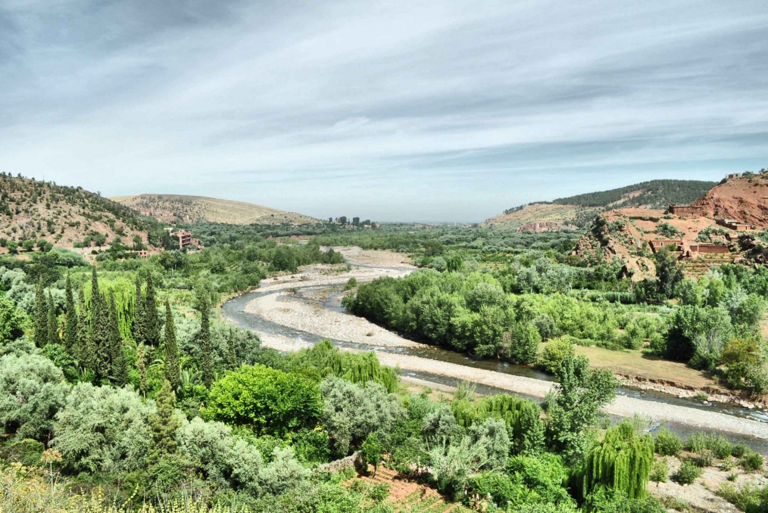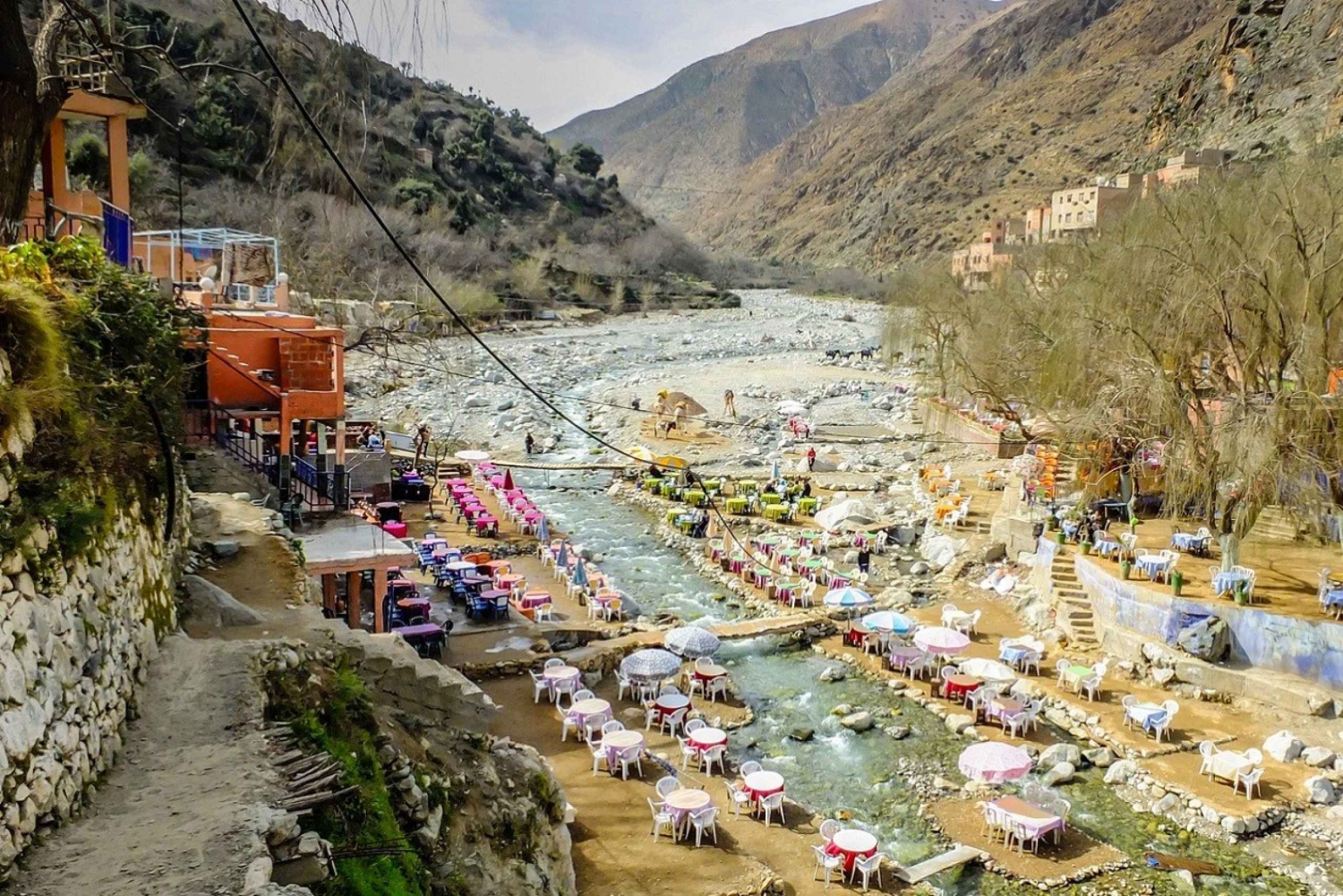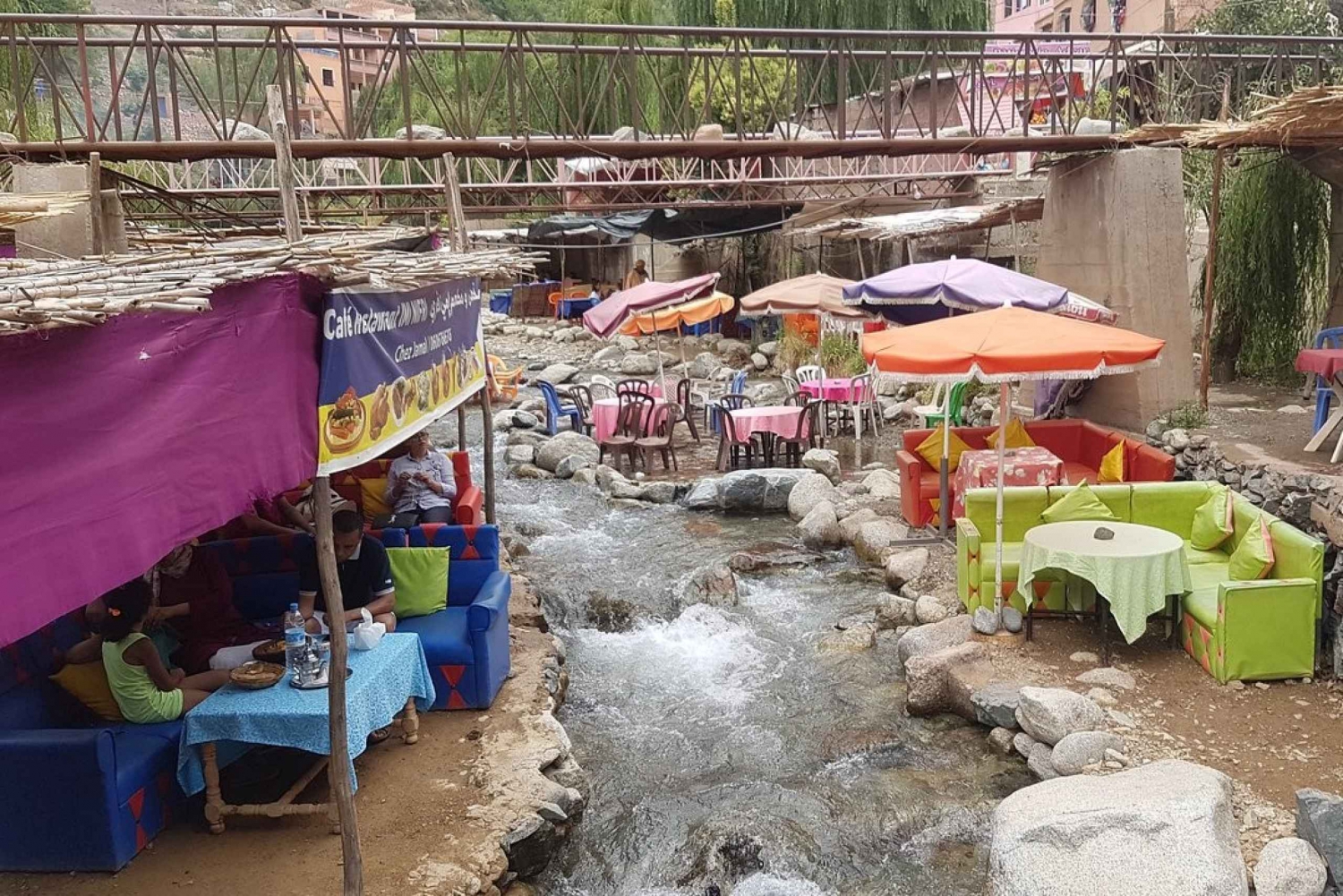 O assistente/guia de turismo irá informá-lo sobre todos os detalhes do seu dia. Ao deixar a agitação da cidade para trás, vais aventurar-te numa pitoresca região montanhosa rica em património cultural. Aqui, vais descobrir o estilo de vida tradicional do povo Amazigh (berbere), cuja cultura vibrante e ligação à terra resistiram ao teste do tempo. Para quem participar numa segunda ou quinta-feira, vai ter a oportunidade extraordinária de visitar um souk (mercado) local, um vislumbre raro e autêntico da vida quotidiana no vale. Este mercado movimentado é onde as famílias Amazigh locais compram os seus alimentos e artigos essenciais. No caminho para o vale, também pode optar por uma breve paragem numa cooperativa de mulheres que produz produtos de óleo de argão, que vão desde produtos cosméticos até ao famoso Nutella berbere (Amlou), oferecendo uma visão sobre o artesanato da região. A excursão continua à medida que chega a Setti Fatma, uma encantadora aldeia no coração do vale. Aqui, um guia local irá conduzi-lo numa caminhada de uma hora até uma cachoeira de tirar o fôlego. Para aqueles que preferem não caminhar, a margem serena do rio oferece um refúgio tranquilo para relaxar e mergulhar na beleza natural. Depois, você desfrutará de uma deliciosa refeição à beira do rio (custo não incluído) antes de retornar a Marraquexe, com chegada prevista para as 17h.