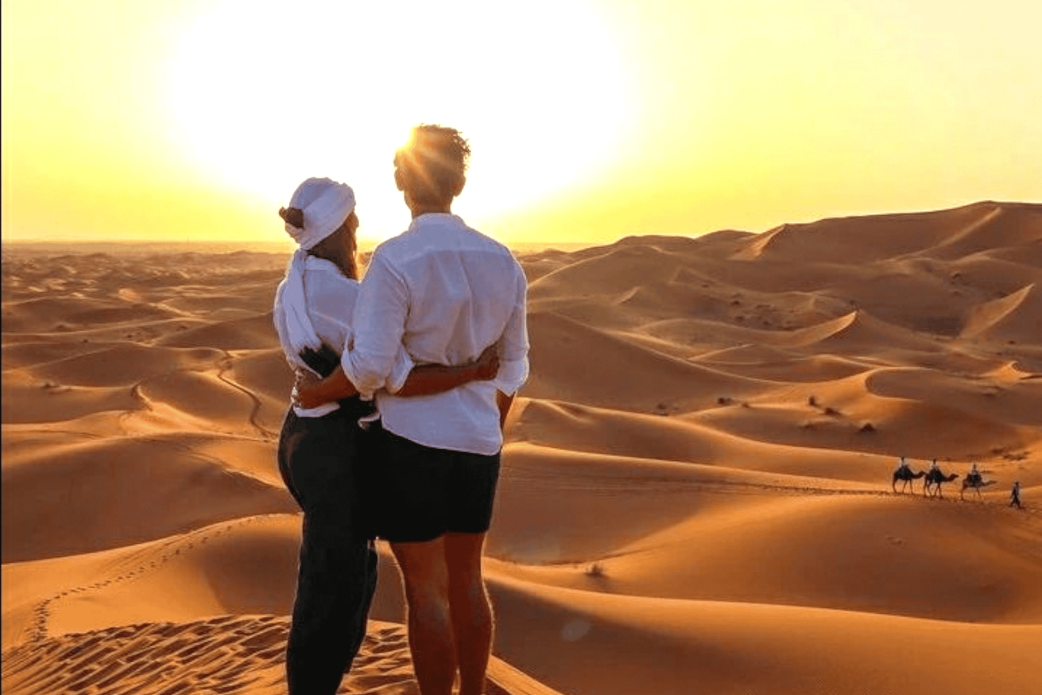- Passeio de camelo mágico e embarque na areia e pôr do sol de tirar o fôlego em Erg Chebbi