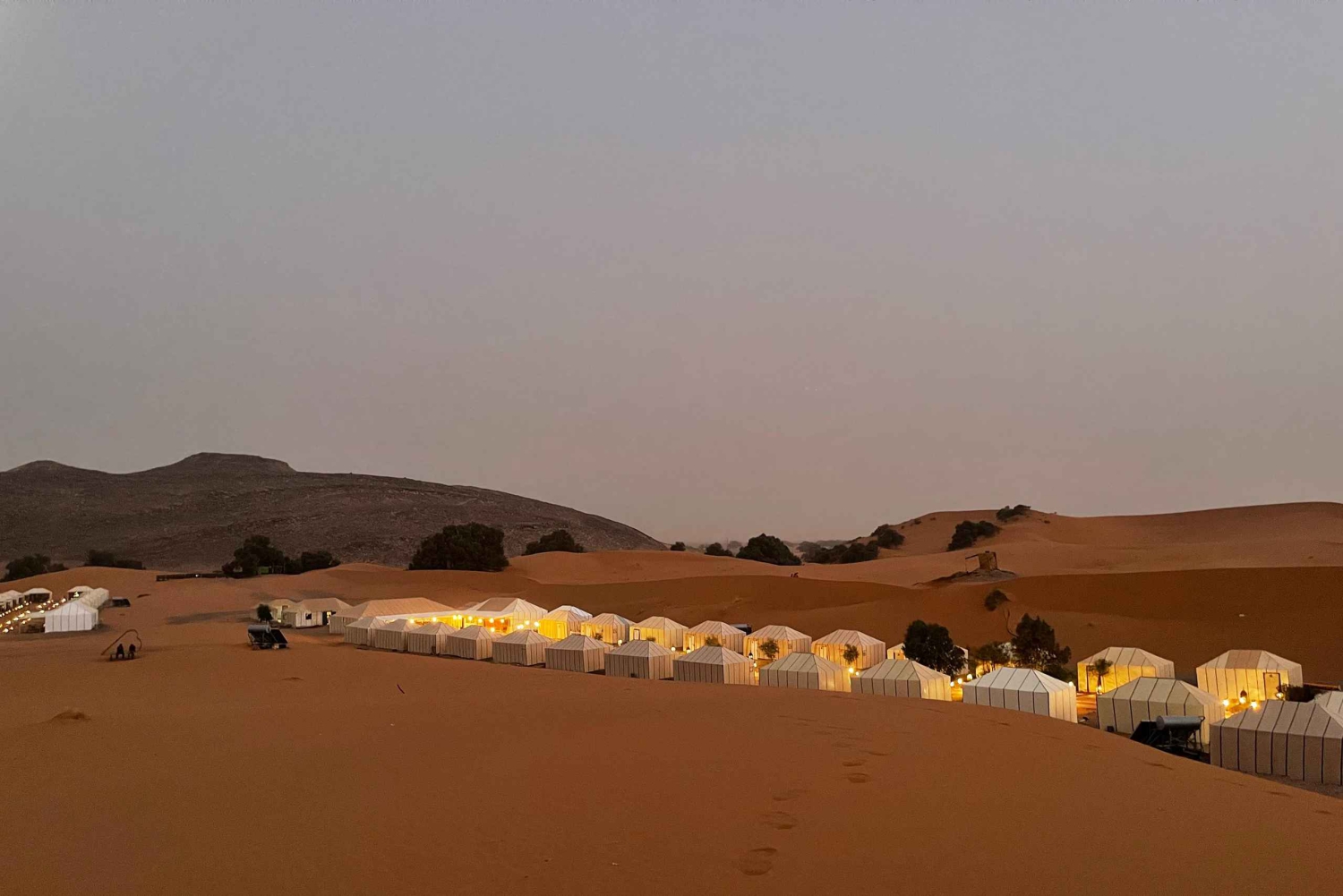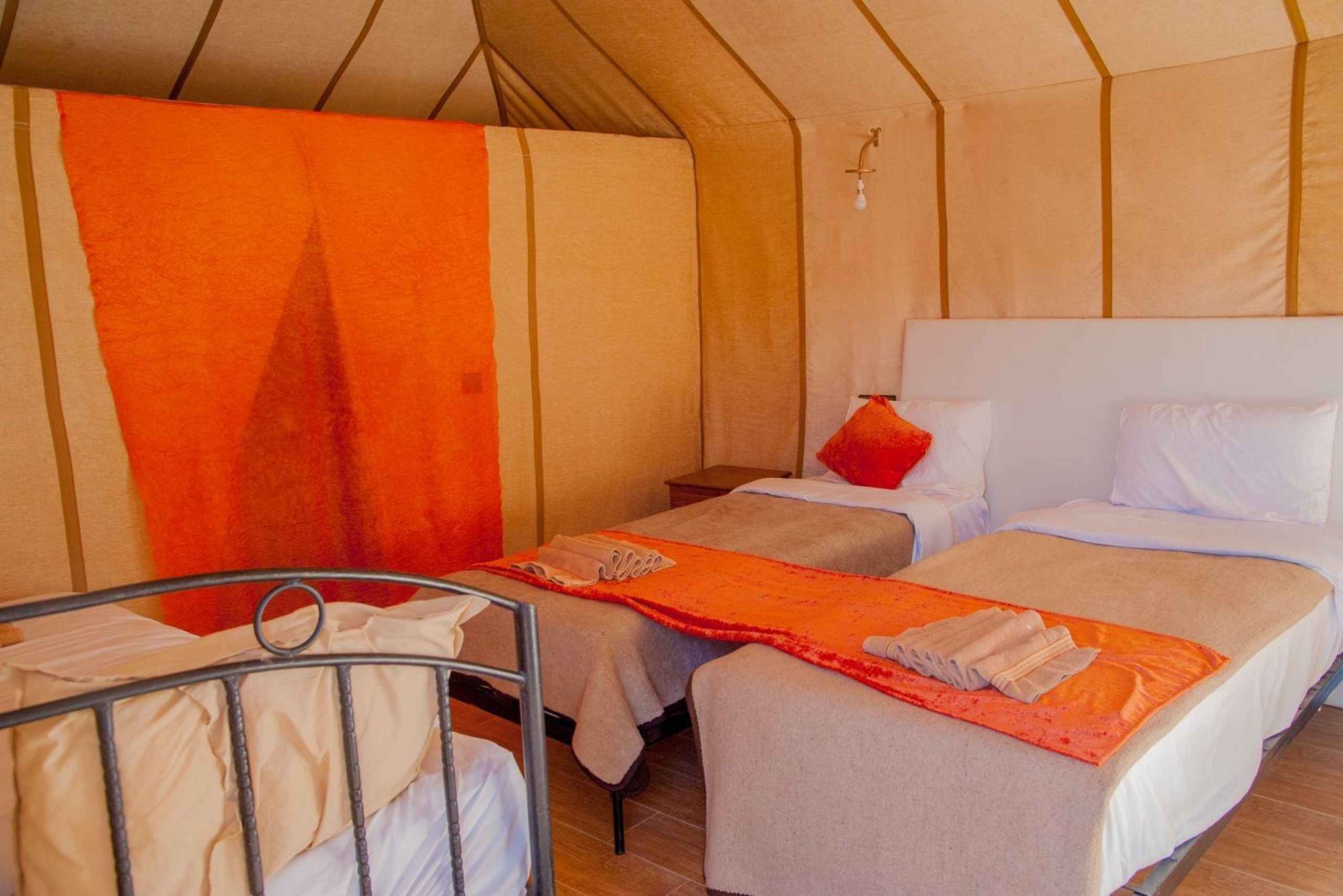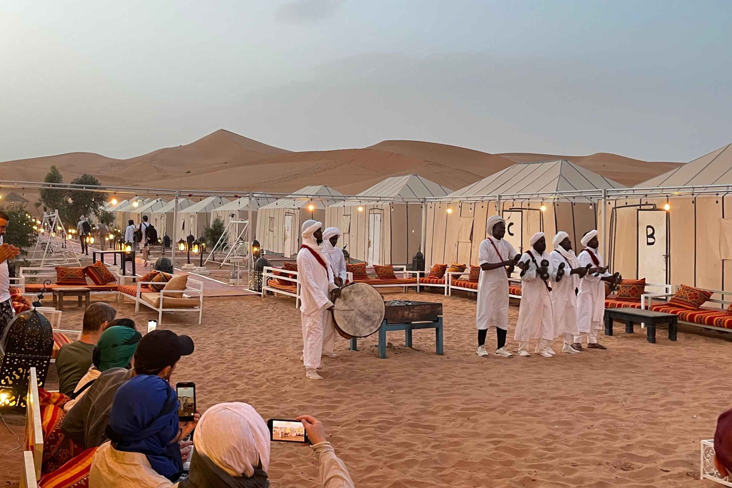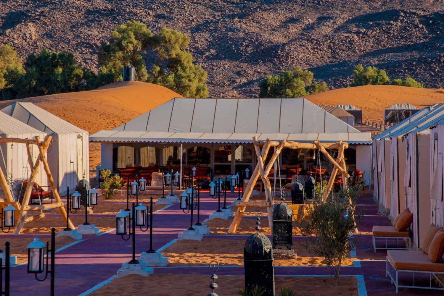 Serviço de busca e volta no hotel ou riad. Transporte com ar-condicionado. Motorista-guia. 1 noite de acomodação em hotel e banheiro e chuveiro privativos. 1 noite de acomodação em um acampamento no deserto. Tenda privativa de luxo, banheiro privativo e chuveiro. 2 jantares. 2 cafés da manhã. Passeio de camelo ao pôr do sol em Erg Chebbi. Passeio de camelo ao nascer do sol em Erg Chebbi. Sandboarding. Serviço de bagagem. Música berbere e experiência com tambores.
