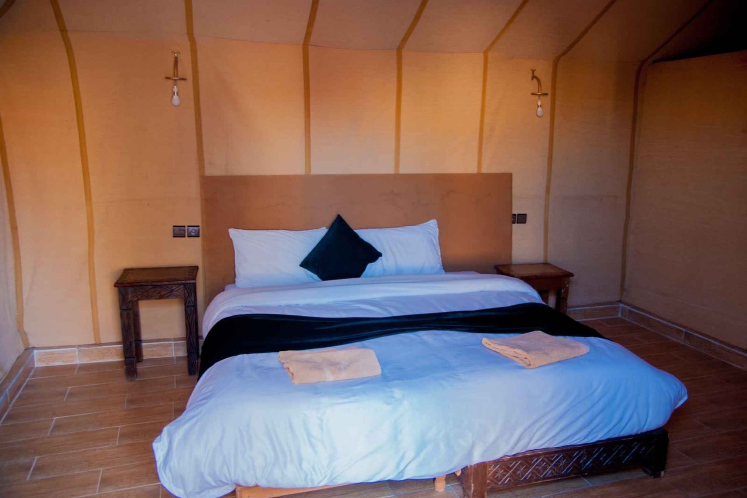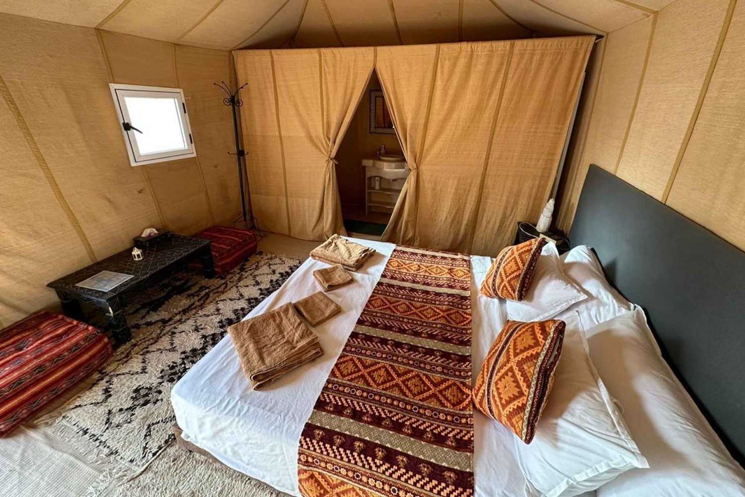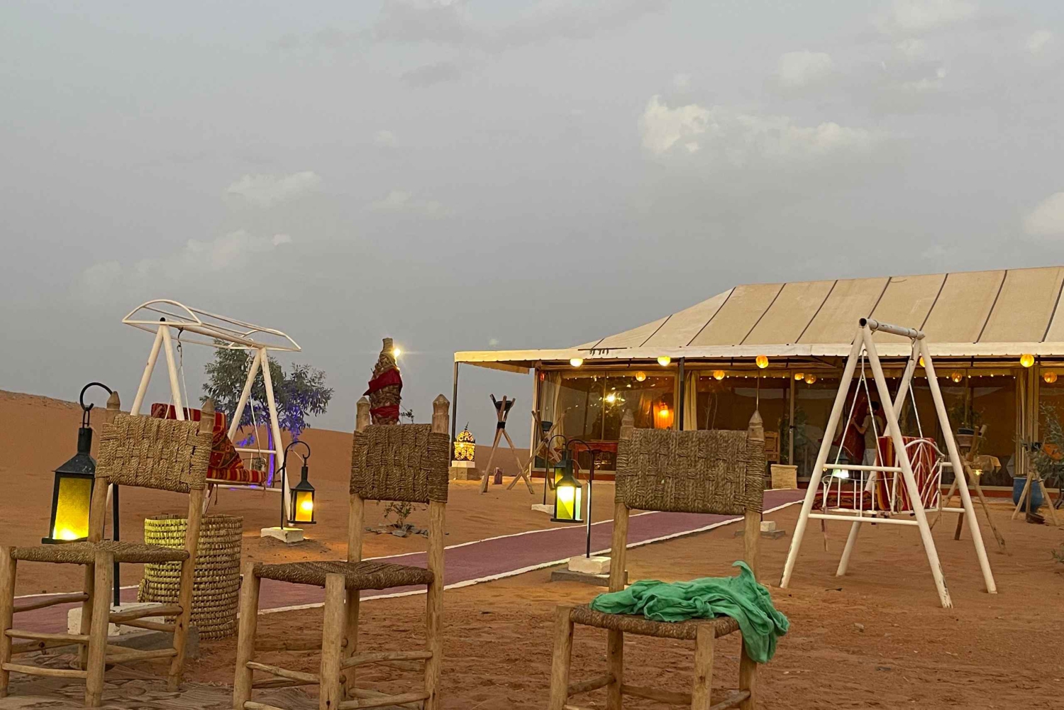 Serviço de busca e volta no hotel ou riad. Transporte com ar-condicionado. Motorista-guia. 1 noite de acomodação em hotel e banheiro e chuveiro privativos. 1 noite de acomodação em um acampamento no deserto. Tenda privativa de luxo, banheiro privativo e chuveiro. 2 jantares. 2 cafés da manhã. Passeio de camelo ao pôr do sol em Erg Chebbi. Passeio de camelo ao nascer do sol em Erg Chebbi. Sandboarding. Serviço de bagagem. Música berbere e experiência com tambores.