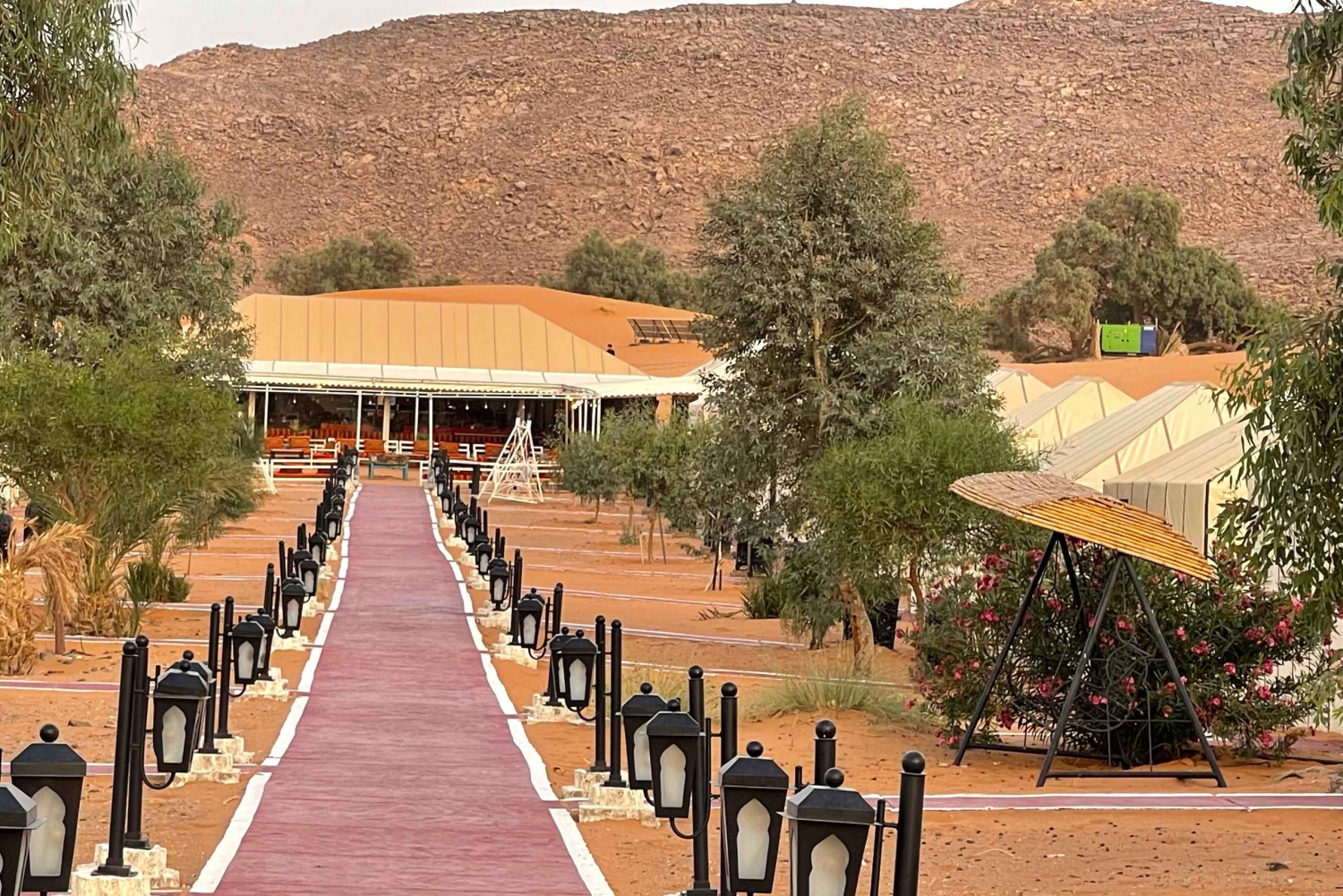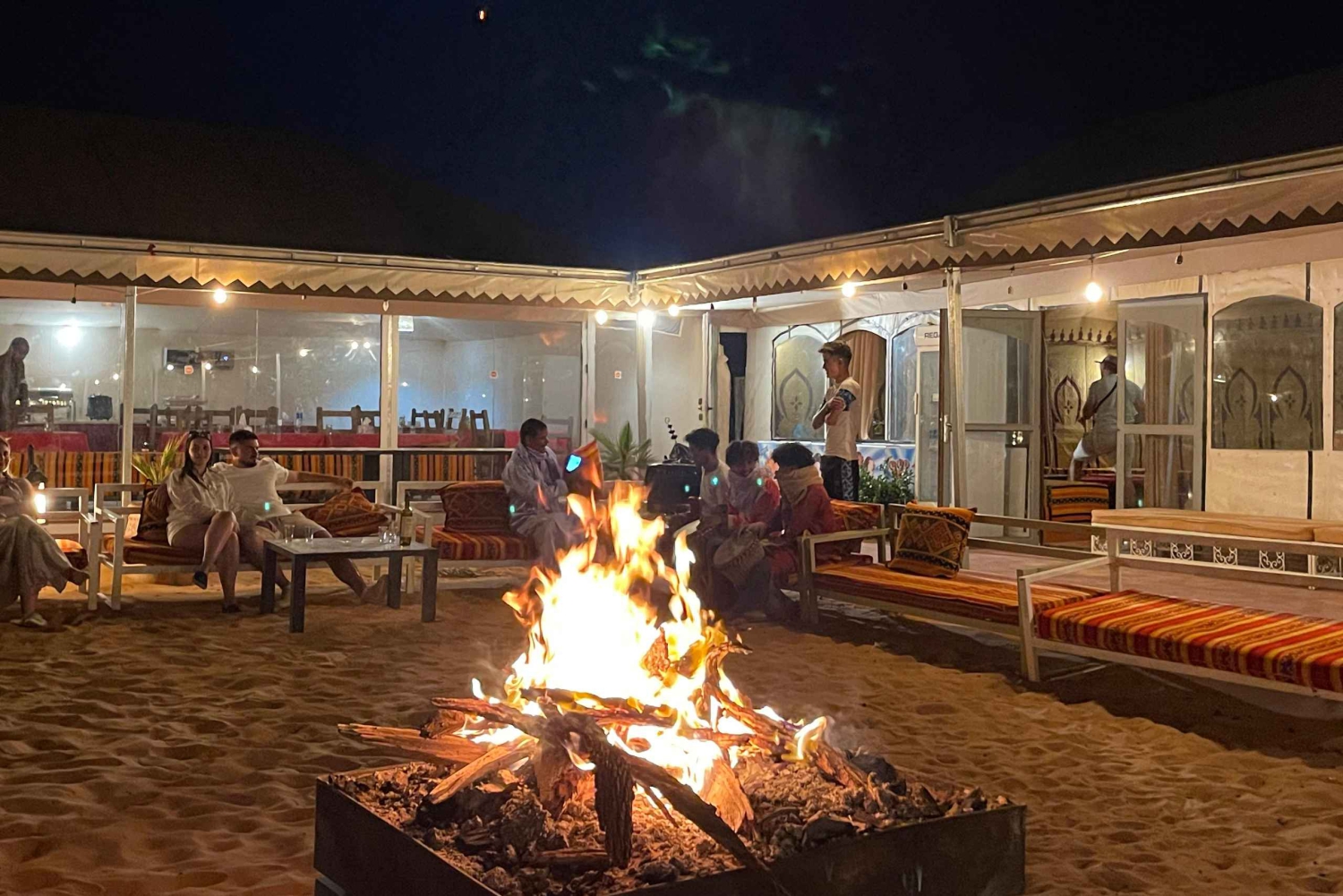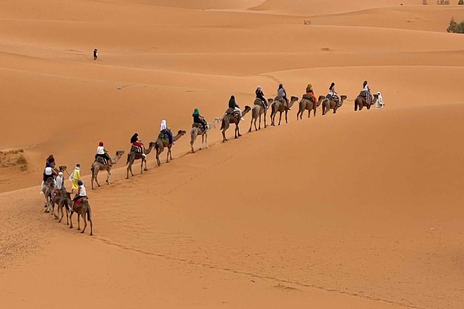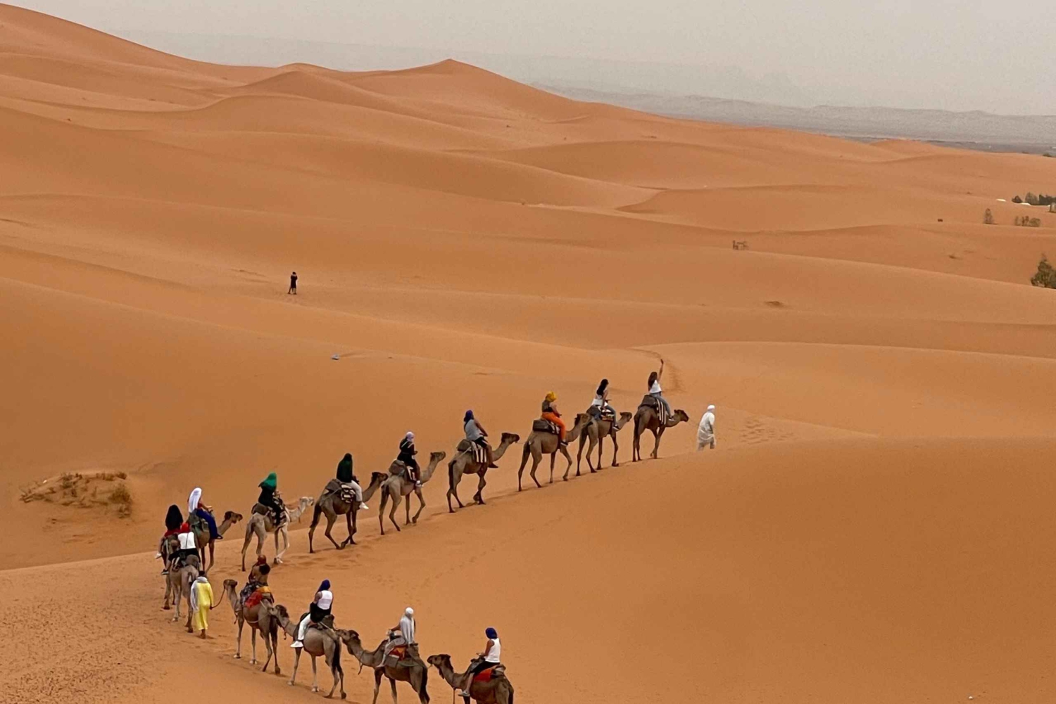 Serviço de busca e volta no hotel ou riad. Transporte com ar-condicionado. Motorista-guia. 1 noite de acomodação em hotel e banheiro e chuveiro privativos. 1 noite de acomodação em um acampamento no deserto. Tenda privativa de luxo, banheiro privativo e chuveiro. 2 jantares. 2 cafés da manhã. Passeio de camelo ao pôr do sol em Erg Chebbi. Passeio de camelo ao nascer do sol em Erg Chebbi. Sandboarding. Serviço de bagagem. Música berbere e experiência com tambores.