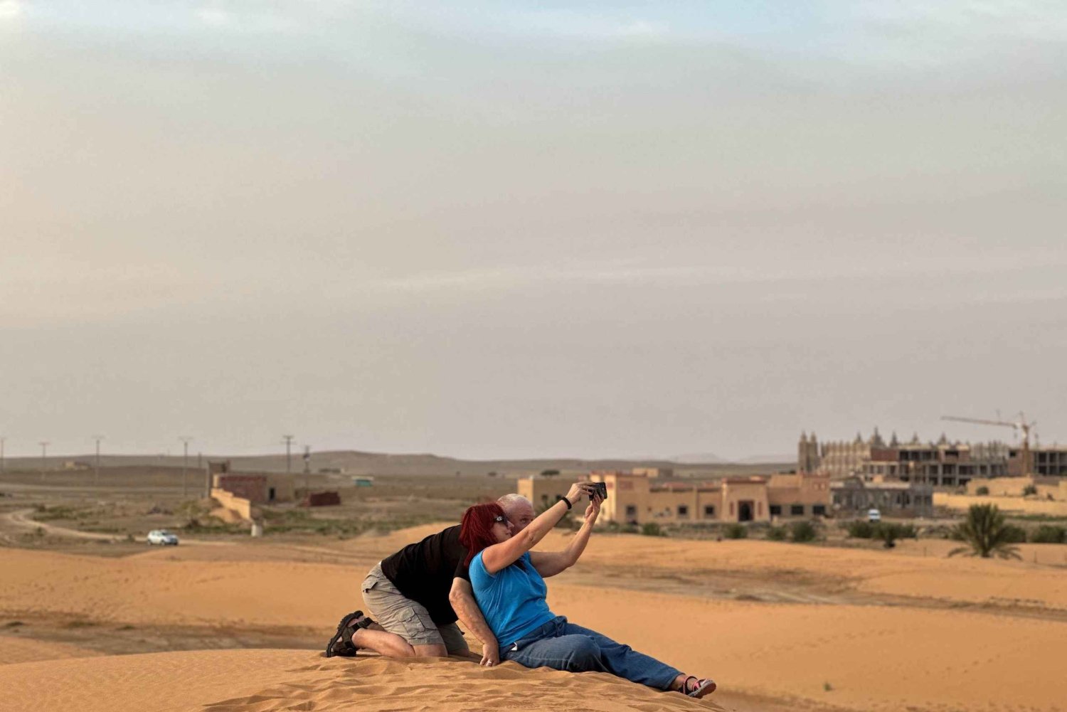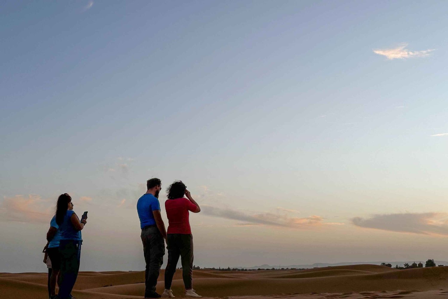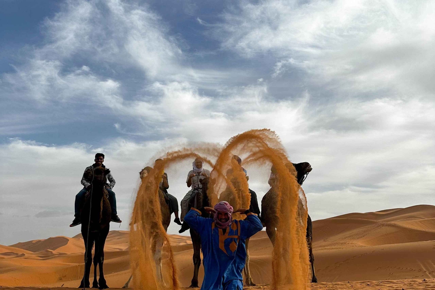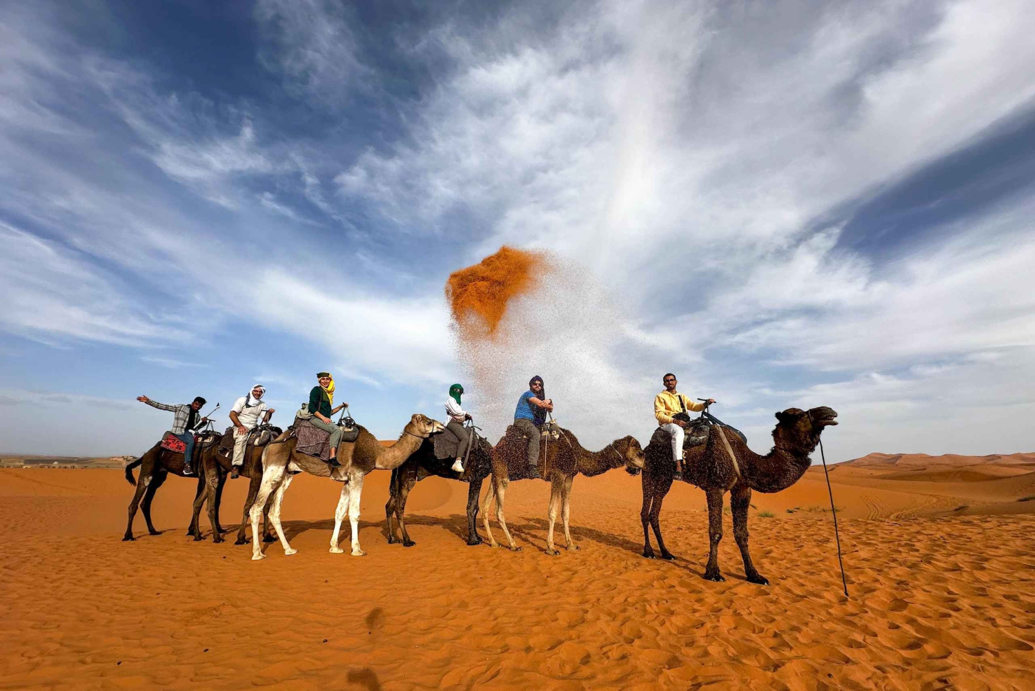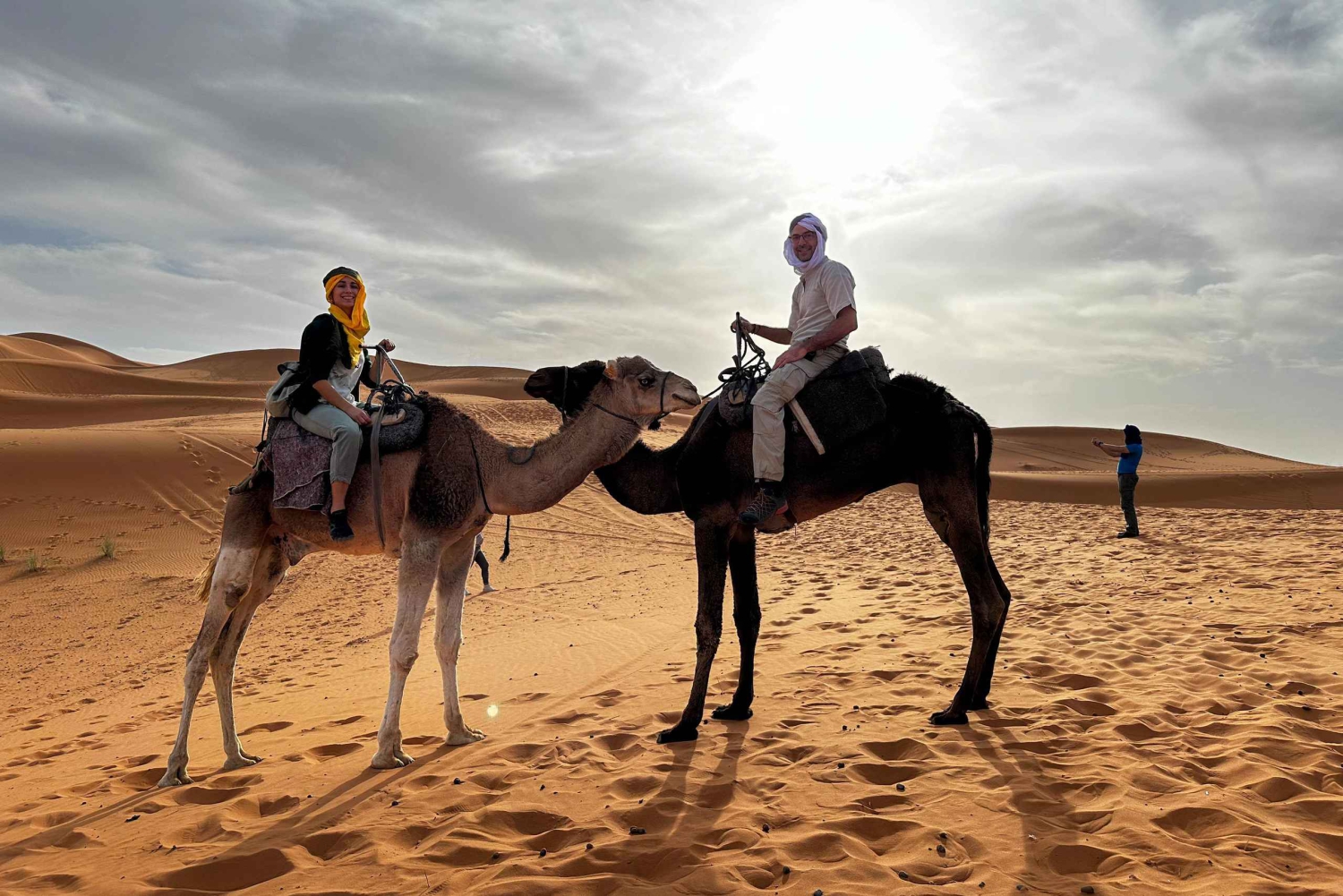 Vive a vida de um berbere num safari de 2 dias no deserto em Zagora e no Vale do Draa, a partir de Marraquexe ou Ouarzazate. Experimenta as dunas de areia movediças no dorso de um camelo, dorme sob um dossel de estrelas e segue os passos da realeza de Hollywood numa visita à aldeia de Ait Ben Haddou, património mundial. Dia 1: Marraquexe ou Ouarzazate - Zagora Depois de um serviço de busca no hotel ou riad em Marraquexe, atravessa as Montanhas do Alto Atlas para te levar numa viagem panorâmica até à aldeia de Ait Ben Haddou, património mundial. Reconhecida instantaneamente como cenário de vários épicos de Hollywood, é também um cenário popular para sessões fotográficas de revistas e agências de moda internacionais. Explora o Kasbah à vontade, com algum tempo livre para almoçar, Continua para o oásis de Agdez, antes de passares pelas tâmaras e palmeiras do Vale do Draa. Maravilha-se com os Kasbahs fortificados ao longo do caminho. À chegada a Zagora, encontra a tua caravana de camelos e passeia de camelo pelas dunas de areia enquanto observas o pôr do sol a pintar as areias do deserto. Depois, transfere-te para o teu acampamento no Deserto do Saara pouco antes de escurecer. Instala-te na tua tenda e desfruta de algum tempo livre para explorar a paisagem desértica circundante. O jantar será servido sob as estrelas enquanto os teus anfitriões nómadas te entretêm à volta de uma fogueira com o ritmo dos seus tambores tamtam. Dia 2: Zagora - Marraquexe Acorda cedo para experimentar a magia de um nascer do sol no deserto (opcional). Depois, desfruta do pequeno-almoço antes de voltares para a sela do teu camelo para o passeio de regresso à estrada principal. Aqui, o teu minibus estará à espera para te levar de volta a Marraquexe, onde chegarás por volta das 18h.Includes