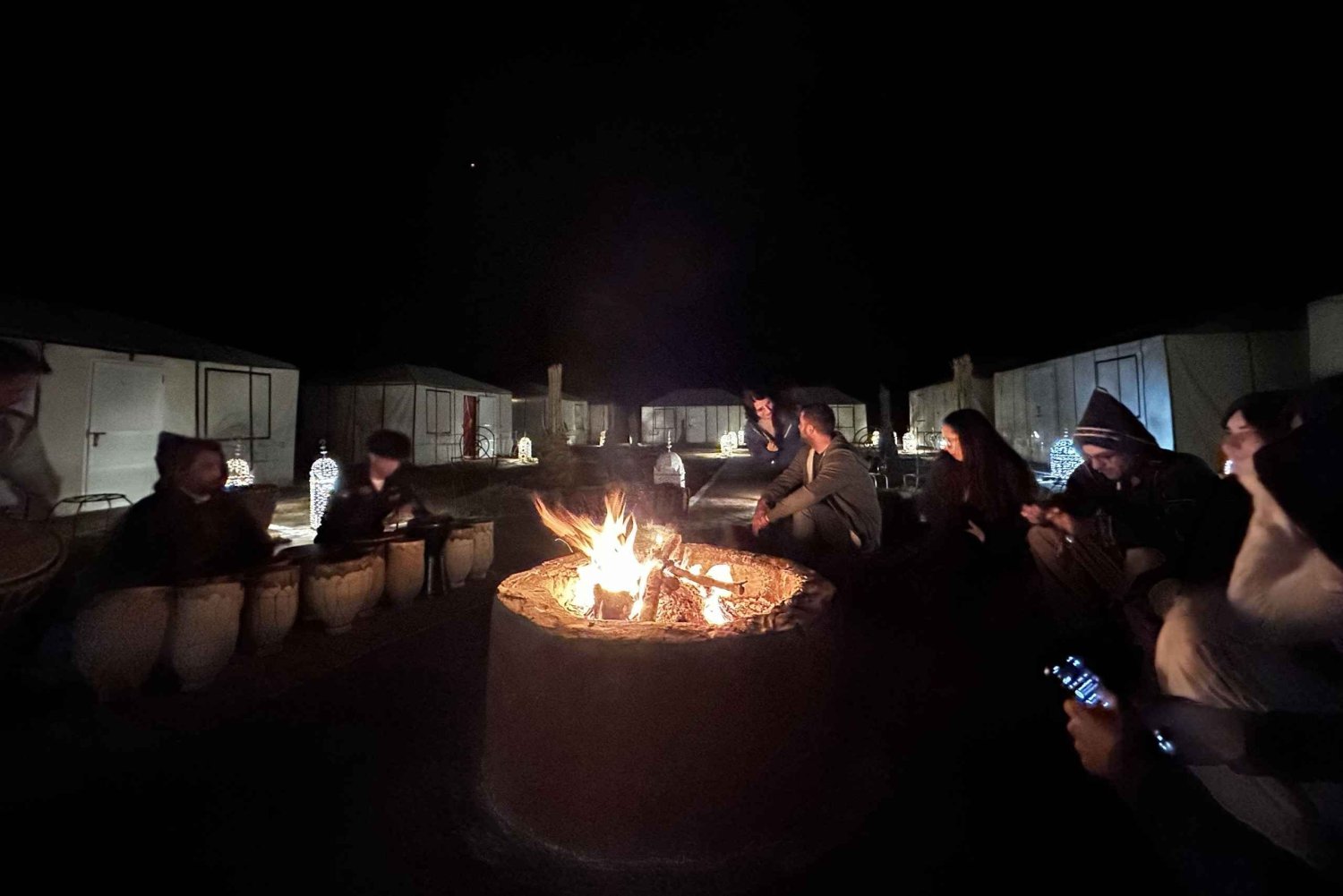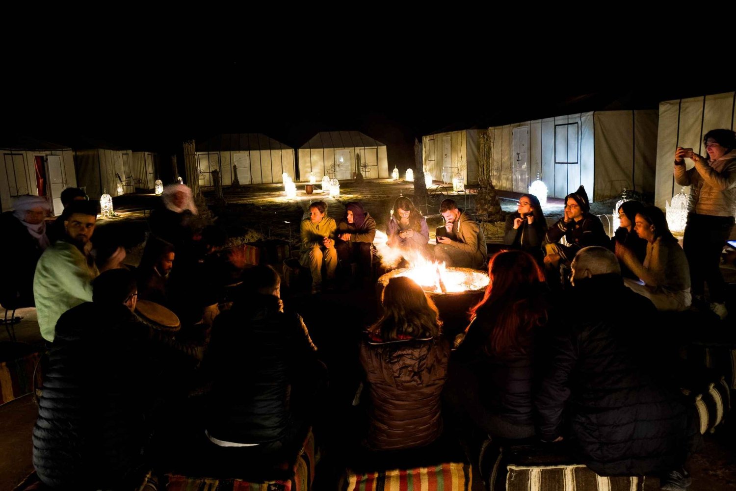 Serviço de busca no hotel em Marraquexe ou Ouarzazate Transporte em minibus com ar condicionado Condutor Passeio de camelo nas dunas de Zagora ao pôr e ao nascer do sol Entretenimento à volta de uma fogueira Estadia num acampamento de luxo no deserto (se selecionado) Excursão em 4x4 (se selecionado) Chuveiros quentes e casas de banho no deserto Jantar do primeiro dia Pequeno-almoço do segundo diaEasy cancellation