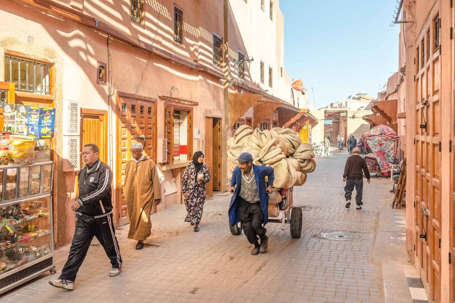 Junte-se a nós numa viagem guiada pelo coração cultural de Marraquexe para explorar os seus marcos icónicos: o Palácio da Bahia, a Medersa de Ben Youssef, o Jardim Secreto e os souks animados. Ao longo do caminho, você vai descobrir séculos de história, se maravilhar com a arquitetura deslumbrante e sentir o pulso vibrante da vida na medina. Vamos começar com uma visita ao exterior da Mesquita Koutoubia, o maior e mais emblemático monumento de Marraquexe. Embora a entrada seja reservada a muçulmanos, vamos admirar a arquitetura almóada majestosa e o minarete alto, visível em toda a cidade. Em seguida, entramos no Palácio da Bahia, uma obra-prima do design marroquino do século XIX. Enquanto você passeia pelos pátios e jardins serenos, vai se cercar de estuque intrincado, mosaicos zellij vibrantes, cedro esculpido e mármore polido, testemunhos do esplendor real do palácio. Depois, vamos para a Medersa Ben Youssef, que já foi a maior faculdade islâmica do Norte de África. Fundada no século XIV e depois reconstruída pelos saadianos, já abrigou mais de 800 alunos. Ao explorar os seus corredores, você vai admirar azulejos intrincados, gesso arabesco e cedro finamente esculpido – obras-primas da arte marroquina. A partir daqui, vamos mergulhar nos souks, o coração pulsante do comércio e da tradição de Marraquexe. Juntos, vamos explorar becos vibrantes cheios de especiarias, têxteis e artigos de couro, enquanto visitamos oficinas de artesanato onde os artesãos ainda criam cerâmica, marcenaria e metalurgia usando técnicas antigas. Enquanto passeamos pela medina listada pela UNESCO, você vai descobrir pátios escondidos, praças movimentadas e vislumbres autênticos da vida cotidiana. Se quiser, podemos terminar com uma visita ao Le Jardin Secret, um oásis tranquilo onde o design de jardim islâmico mistura fontes, flores coloridas e caminhos serenos – um contraste perfeito com a energia dos souks. Terminamos o nosso passeio com memórias para guardar: Marraquexe, onde a história, a arte e a cultura se misturam para surpreender, inspirar e ficar com você por muito tempo depois de partir. Opções de fim de tour No final da excursão, você pode voltar conosco ao ponto de encontro original ou ficar no Le Jardin Secret. Se você ficar, o guia vai arranjar uma entrada sem fila e dar uma breve introdução antes de você explorar os jardins no seu próprio ritmo.Includes