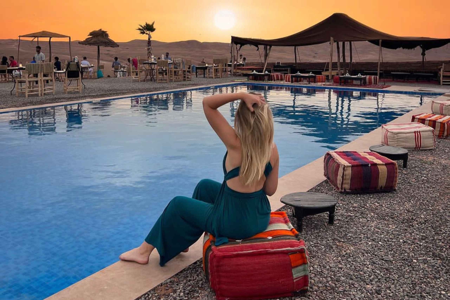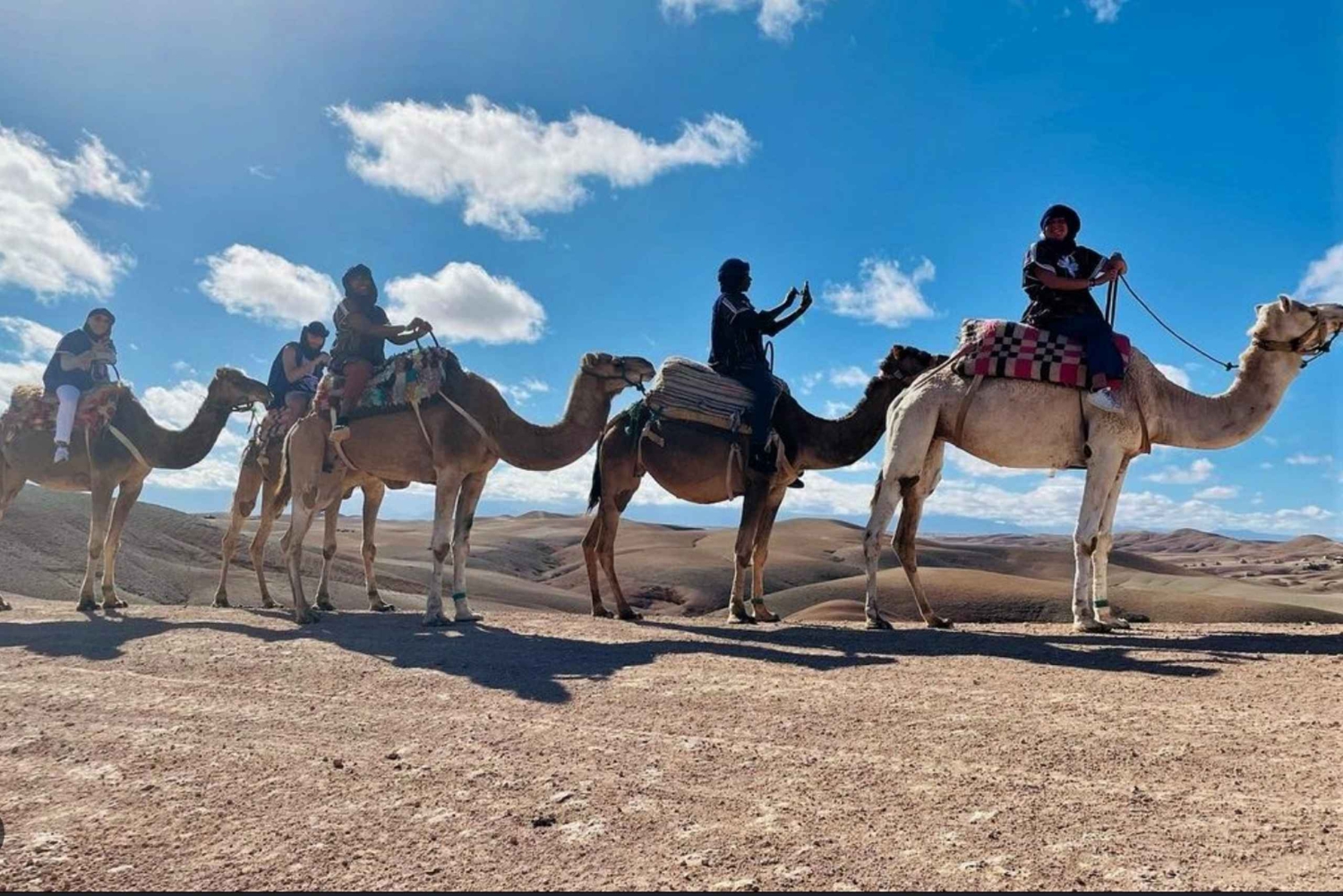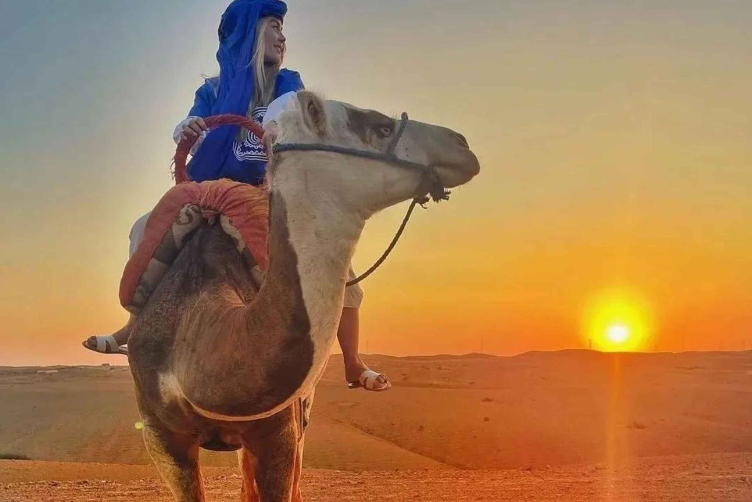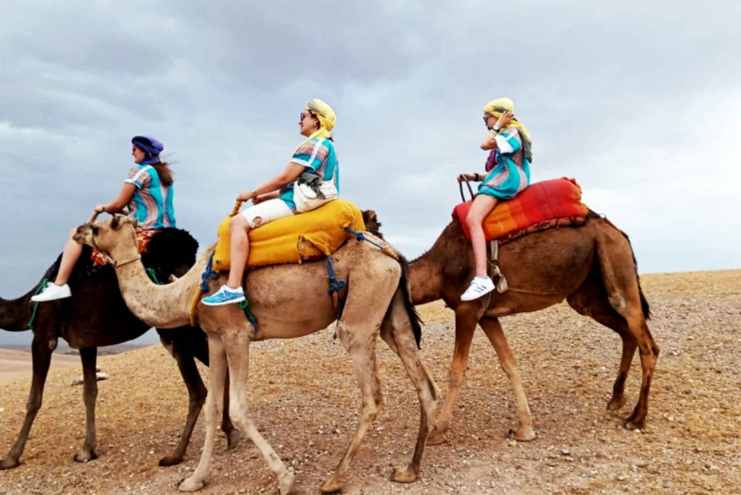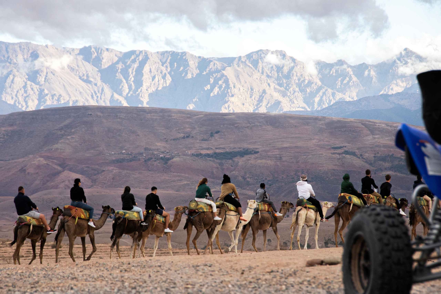 Explore as paisagens deslumbrantes do Deserto de Agafay durante um passeio de camelo de 20 minutos nesta excursão a partir de Marraquexe. Você também vai experimentar um passeio de quadriciclo e curtir um show de jantar assistindo ao pôr do sol. Para começar, um transporte confortável pega você no final da tarde (cerca de 40 minutos de carro até o deserto cénico e rochoso de Agafay). Ao chegar a Agafay, você vai curtir um passeio de quadriciclo pelas paisagens desérticas acidentadas (aprox. 1 hora). Vai andar por colinas rochosas, leitos de rios secos e espaços abertos. Vamos te dar todas as instruções de segurança e o equipamento necessário. Este passeio é perfeito tanto para iniciantes quanto para pilotos experientes. Depois de curtir um passeio de quadriciclo, você vai experimentar um passeio de camelo (aprox. 30 minutos) Você vai receber um tradicional cheich marroquino (lenço) para tirar fotos incríveis no seu camelo, especialmente com o pôr do sol ao fundo. Você vai ter tempo para curtir as cores do deserto mudando na hora mágica. Cenário perfeito para uma transição tranquila da atividade para o relaxamento. ️ Depois das suas atividades, você vai terminar com uma experiência de jantar com espetáculo. Você será recebido em um belo acampamento no deserto e vai comer um jantar tradicional marroquino sob as estrelas. O jantar geralmente inclui tagine, cuscuz, saladas, chá e sobremesa. Vai curtir música berbere ao vivo, espetáculos de fogo e dança folclórica num ambiente acolhedor com velas, lanternas e decoração tradicional. Depois do espetáculo, você volta para Marraquexe, e o motorista te leva de volta ao seu alojamento.Includes