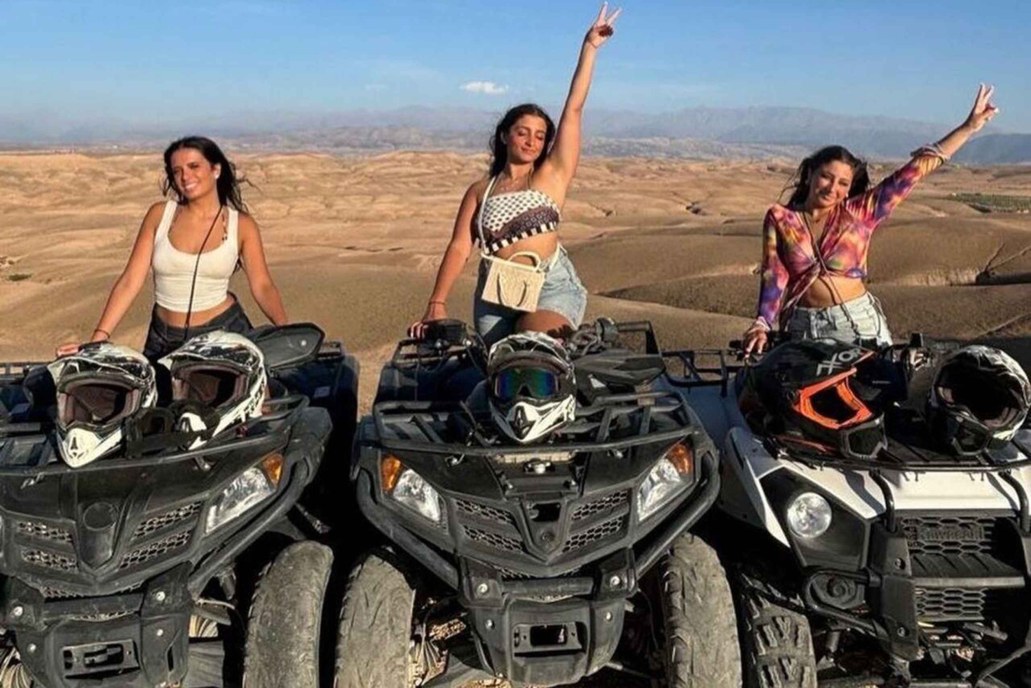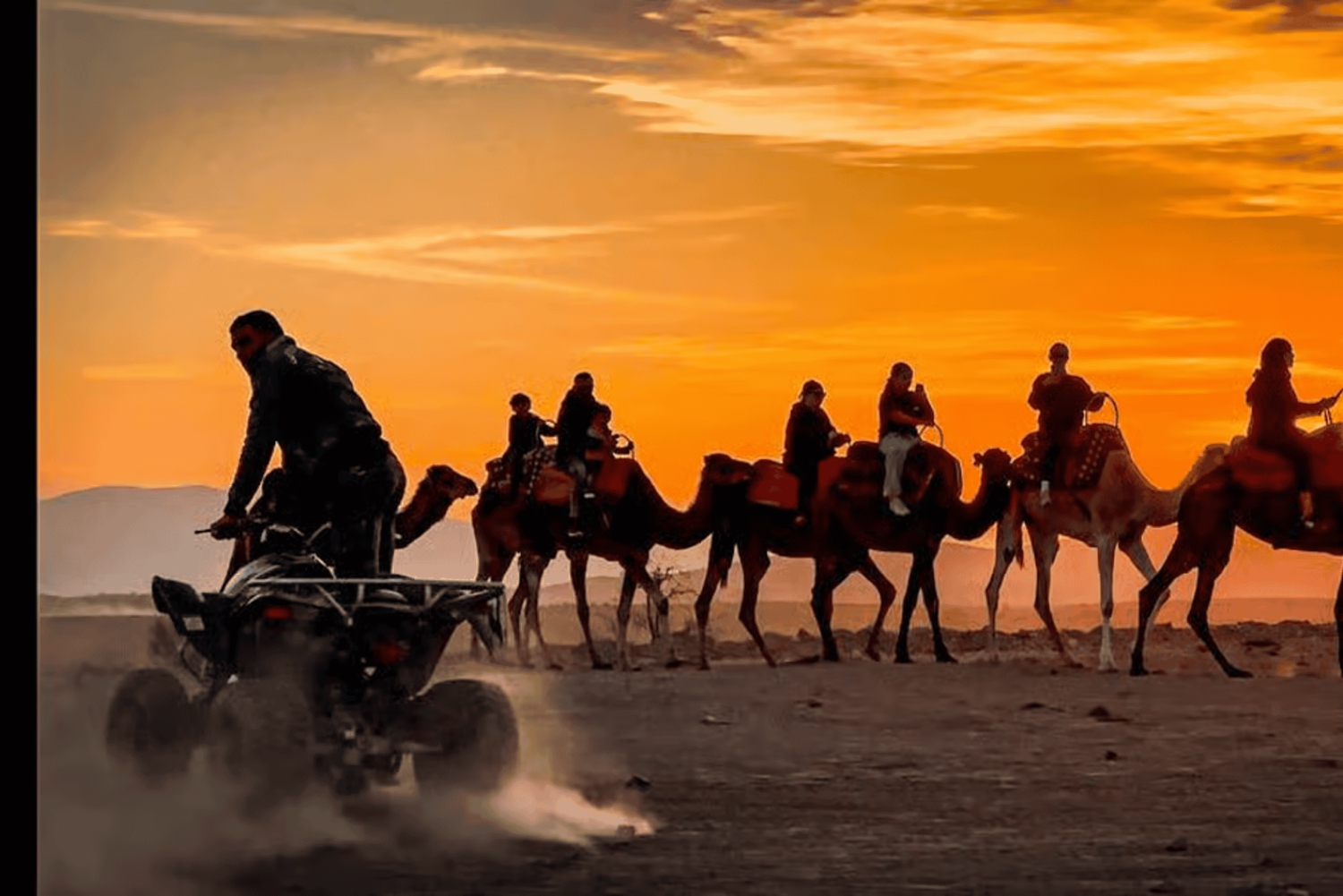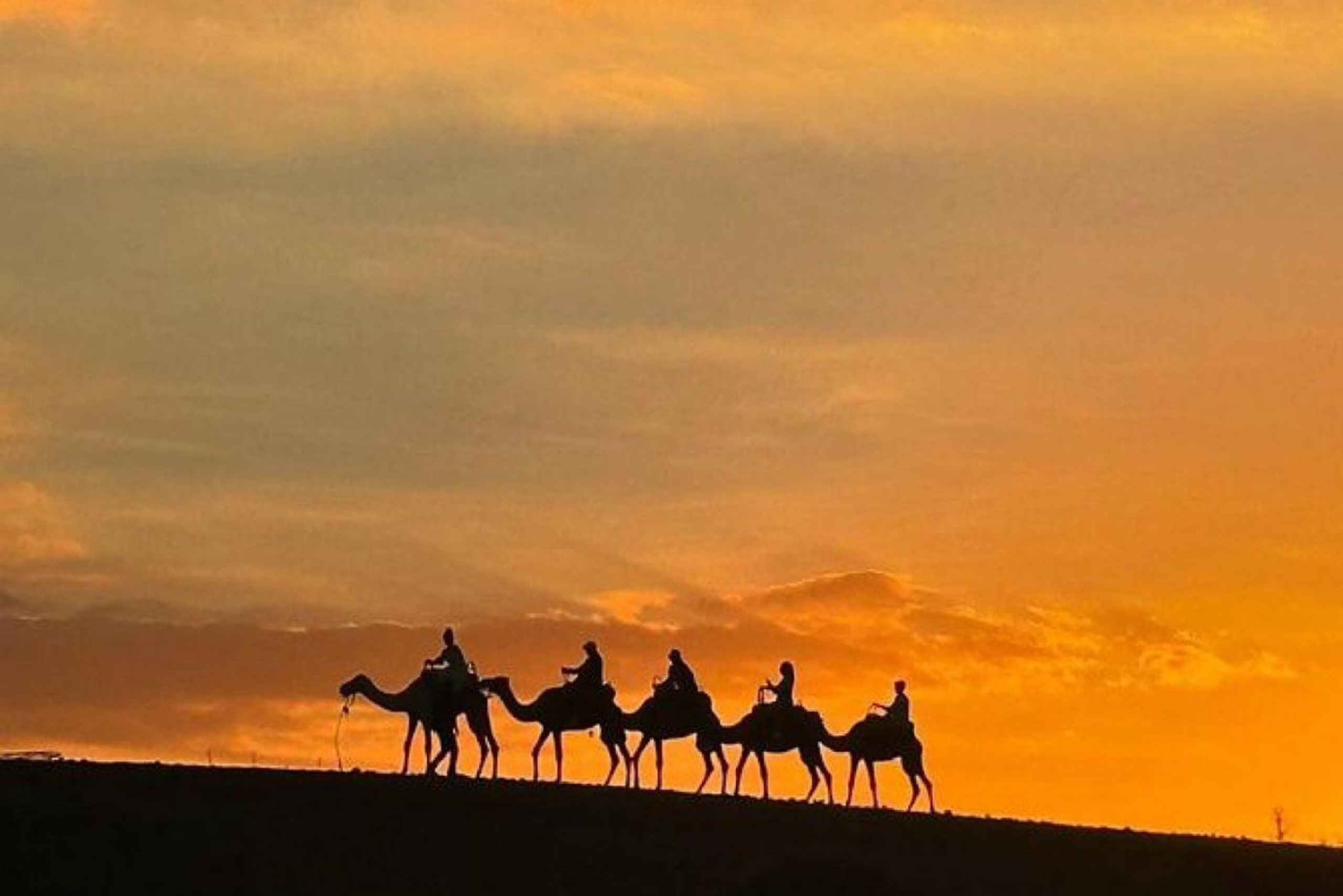 Откройте для себя величайший тур по пустыне из Марракеша в Агафай Отправляясь из оживленного города в захватывающую *пустыню Агафай*, приготовьтесь к незабываемому *пустынному приключению в Марракеше*. Это уникальное приключение сочетает в себе захватывающие действия, культурное исследование и потрясающие пейзажи, что делает его одним из лучших вариантов, чем заняться в *Марракеше*. Начало вашего приключения в пустыне Агафай Удобный трансфер из одного из трех бесплатных мест встречи в Марракеше начнется в *15:00*. Скалистая, похожая на лунный пейзаж *пустыня Агафай* находится в нескольких минутах езды и представляет собой яркий контраст с *Сахарой*. Благодаря своей доступности для людей с инвалидностью, красоте и спокойствию, эта скрытая жемчужина быстро поднимается на вершину списка *популярных туристических направлений в пустыне Марракеша*. Незабываемые мероприятия в пустыне Агафай: *Удивительный опыт катания на квадроцикле в Марракеше* Начните свой тур по пустыне Агафай с захватывающего опыта на квадроцикле в Марракеше. Опытные гиды, для которых ваше удовольствие и безопасность превыше всего, проведут вас по скалистым пустынным тропам. Эта захватывающая сессия на квадроцикле в Марракеше обязательно зарядит вас энергией, независимо от вашего уровня опыта вождения квадроцикла. Прокатитесь на верблюде на закате в Агафай Прокатитесь на верблюде по пустыне Агафай, чтобы перейти от адреналина к спокойствию. Испытайте спокойный ритм *традиционного верблюжьего трекинга в Марокко*, оседлав *верблюда* на закате. Золотой час создает потрясающий фон для фотографий и незабываемых воспоминаний. Вы ищете лучшее *катание на верблюде в Марракеше*? Это путешествие на закате. Вы никогда не забудете этот момент в *Агафай*, будь то *катание на верблюде на закате в Марракеше*, быстрая *поездка на верблюде по пустыне* или полный *тур на верблюде в Марракеше*. Марокканский ужин под открытым небом Приезжайте в наш волшебный *лагерь в пустыне Агафай*, когда наступают сумерки. Здесь вы сможете насладиться *традиционным марокканским ужином*, который включает в себя традиционные блюда, такие как *тажин* из баранины, кускус, сезонные фрукты и свежие салаты. Вечерние *живые музыкальные* и *культурные* представления отражают сущность Марокко. Один из самых запоминающихся аспектов этого *ужина в пустыне в Марракеше* — это ужин на открытом воздухе в пустыне под звездным небом. Почему стоит выбрать этот опыт в пустыне из Марракеша? Эта высоко оцененная экскурсия по пустыне Агафай сочетает в себе традиции и активный отдых в один идеальный вечер. *Идеально для всех путешественников*: идеально подходит для семей, групп, пар и одиночных путешественников. Включая *бесплатный трансфер из Марракеша и обратно*, этот пакет обеспечивает беззаботное путешествие. *Аутентичный и захватывающий*: это полное *культурное путешествие*, охватывающее всё: от *ужина и живых выступлений* до *езда на квадроциклах и катания на верблюде в Агафае*.Includes