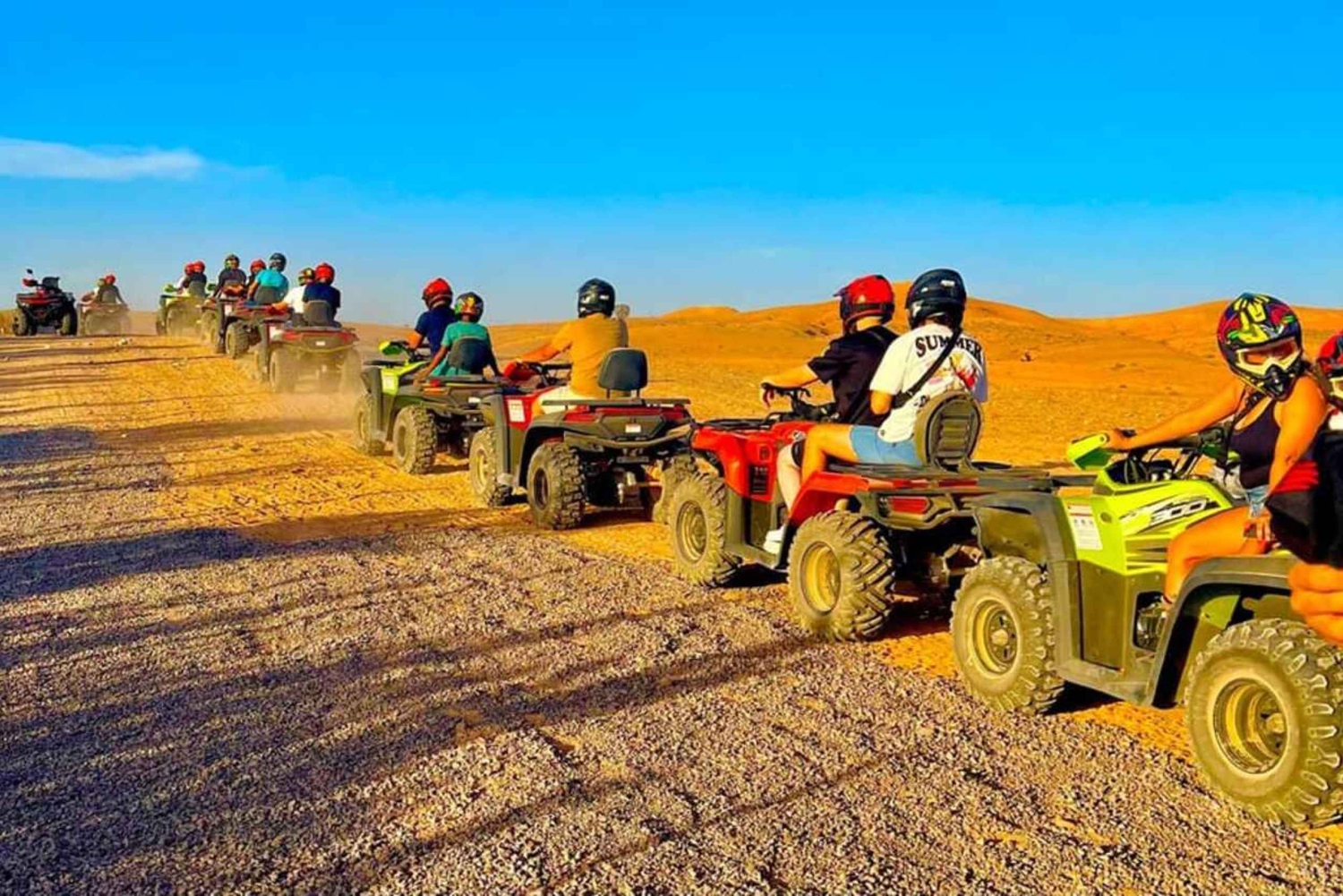 Трансфер от/до отеля или ближайшего к вашему риаду места Трансфер на микроавтобусе с кондиционером Услуги местного экскурсовода Вода ПОЛУЧАСОВАЯ поездка на квадроцикле (совместно с другим человеком) 20-минутное катание на верблюде Ужин из 3 блюд (марокканский таджин, кускус и марокканский суп харира) Живая марокканская музыка Огненное шоу чайImportant Information