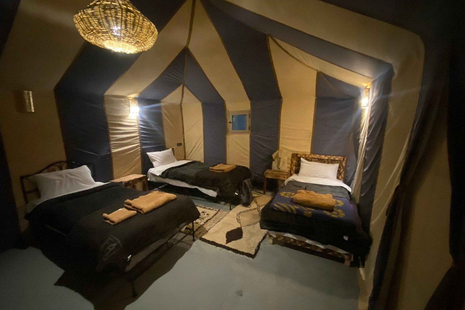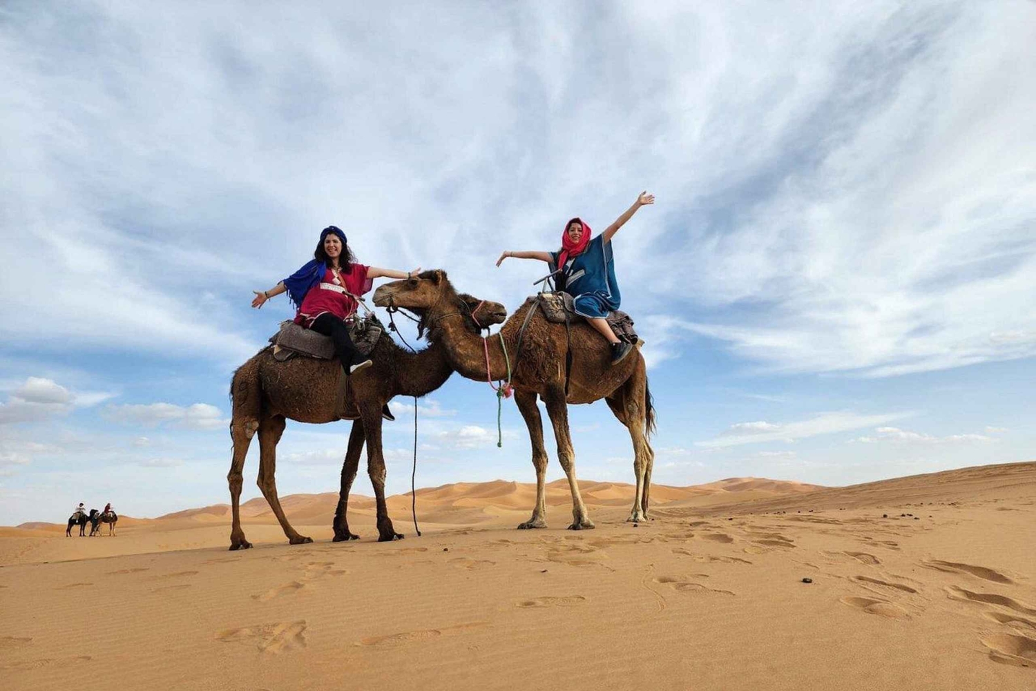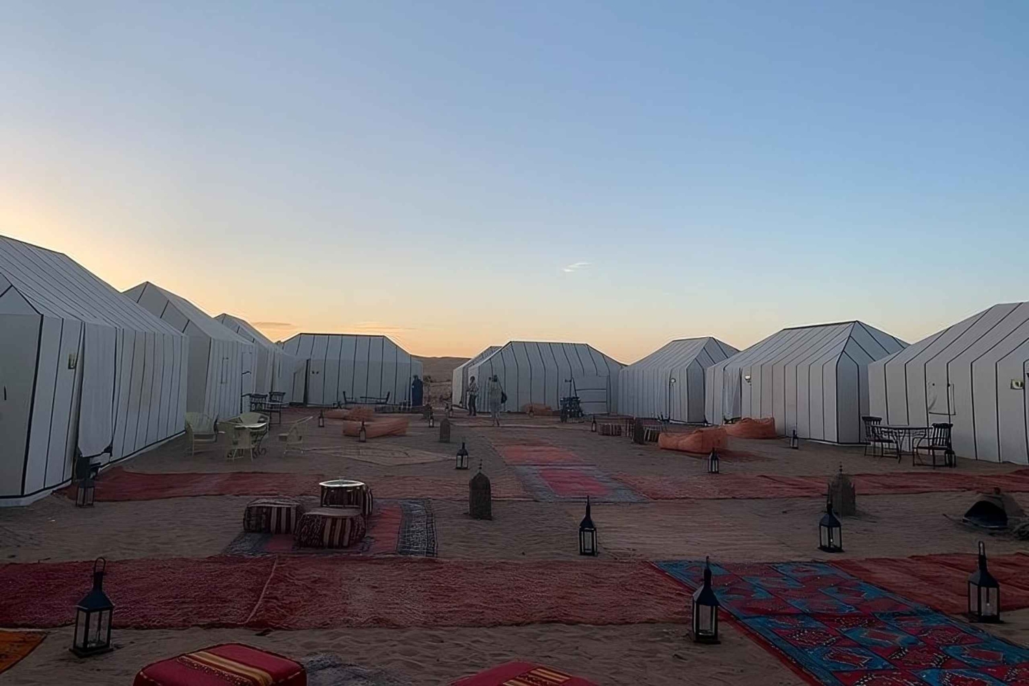 Отправьтесь в приключенческое путешествие по пустыне Сахара на 2 дня/1 ночь из Феса, предлагающее подлинное сочетание природной красоты Марокко, культурного богатства и роскошного комфорта. Пересеките потрясающие горы Среднего Атласа, прокатитесь на верблюде на закате по золотым дюнам Мерзуги и проведите незабываемую ночь в роскошном лагере в пустыне. Погрузитесь в очаровательные местные традиции и насладитесь уникальным местным гостеприимством. От завораживающего восхода солнца в Мерзуге до исследования очаровательной Долины роз — это путешествие создано для того, чтобы дать вам возможность увидеть разнообразные ландшафты и культурные сокровища Марокко. Откройте для себя Марокко так, как немногие смогут увидеть. Основные моменты первого дня включают посещение живописного города Ифран, встречу с маго-обезьянами в пышном лесу Седре Гуро и восхищение потрясающими горами Среднего Атласа. После обеденного перерыва в Зайде отправляйтесь в очаровательную пустыню Мерзуга. Наслаждайтесь поездкой на верблюде на закате, фотографированием песчаных дюн и незабываемой ночью под звездами в роскошном палаточном лагере с ужином, музыкой у костра и танцами. День 2 начинается с завораживающего восхода солнца и завтрака в Мерзуге. По пути в Марракеш посетите очаровательную Долину Роз, остановитесь на обед и осмотрите кооператив розовой воды. Полюбуйтесь панорамным видом с Тизи-н-Тичка, расположенного на высоте 2260 метров над уровнем моря, прежде чем прибыть в Марракеш.Includes