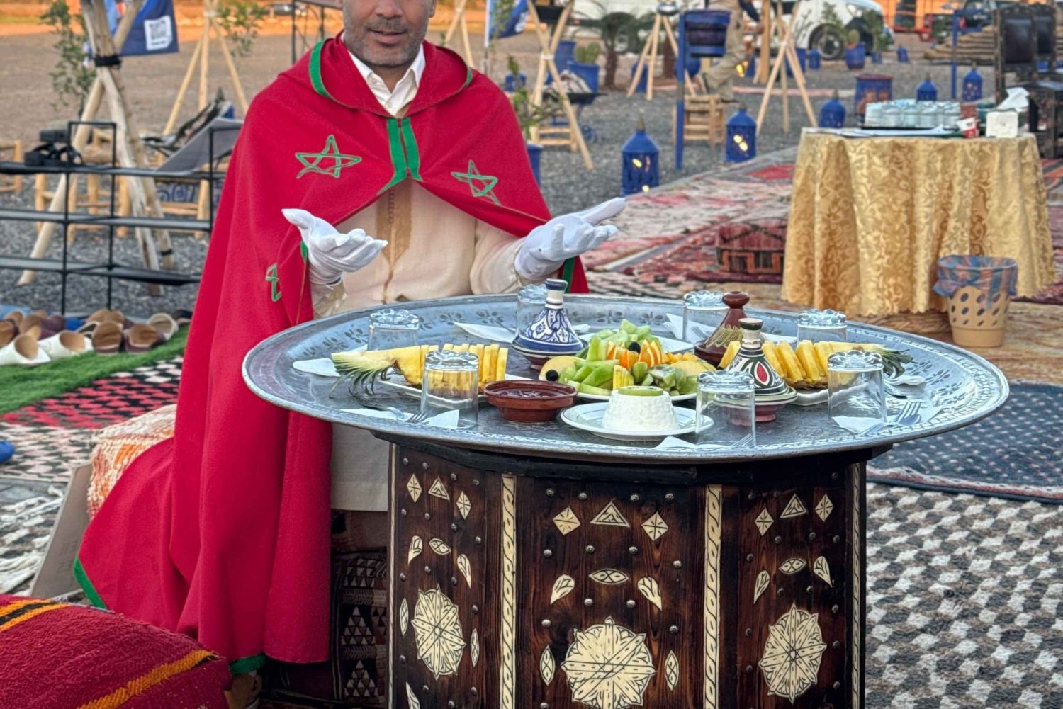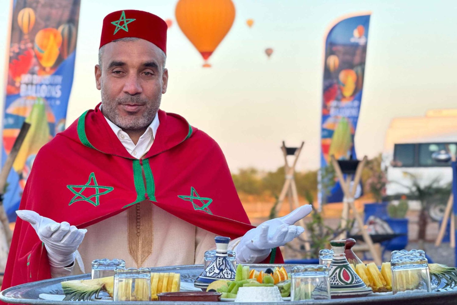 Start your day with a magical sunrise experience combining elegance, nature, and authentic Moroccan hospitality. Be picked up from your hotel or a designated meeting point (if your accommodation is difficult to access or outside the city). After a short, comfortable drive, arrive at a stunning panoramic location overlooking the Atlas Mountains, where colorful hot air balloons fill the morning sky. Upon arrival, be warmly welcomed with traditional Moroccan tea and coffee, as you relax and enjoy the calm atmosphere while waiting for the balloons to take flight. Then, witness the mesmerizing spectacle of dozens of hot air balloons rising gracefully into the golden light of dawn — a truly unforgettable scene. Next, delight in a royal breakfast carefully prepared with a selection of local and international treats: fresh fruits, pastries, cheeses, local honey, artisanal bread, natural juices, and rich Turkish coffee. Your table is beautifully set, offering a perfect view of the Atlas Mountains and the vibrant balloons above. After this exceptional morning, be comfortably driven back to your hotel or meeting point, carrying unforgettable memories of serenity, beauty, and Moroccan charm.Includes