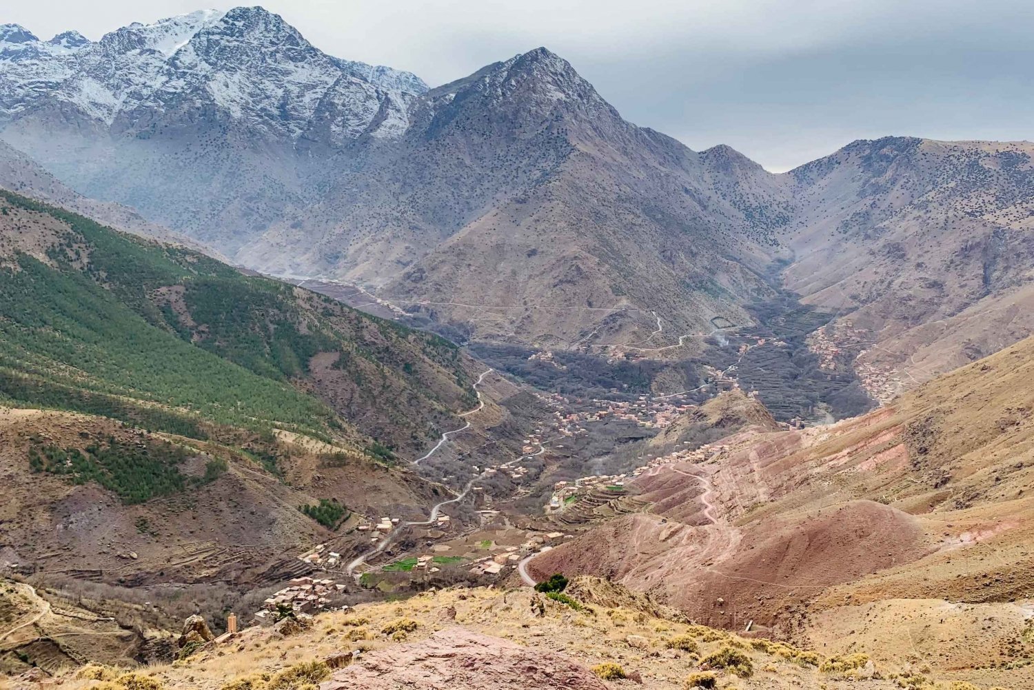 Upplev de majestätiska Atlasbergen med en dagsutflykt till Imlil, en pittoresk berberby. Detta äventyr inkluderar bekväm transport, en kunnig guide, en naturskön vandring och en utsökt traditionell lunch. Njut av bekväm upphämtning från ditt hotell eller riad i Marrakech runt kl. 8:00. Koppla av i ett luftkonditionerat fordon när du reser genom fantastiska landskap, passerar traditionella berberbyar och vackra dalar. Ankomst till Imlil, som ligger på 1.740 meters höjd. Här möter du din lokala guide som kommer att leda dig genom dagens aktiviteter. Lär dig mer om berberfolkets kultur och historia och om Imlils betydelse. Ni ger er ut på en guidad vandring som varar 2-3 timmar och som är anpassad efter er kondition. Vandringslederna erbjuder hisnande utsikt över de omgivande bergen och dalarna. Din guide kommer att dela med sig av insikter om flora, fauna och lokala traditioner när du vandrar genom det fantastiska landskapet. Efter vandringen avnjuter ni en traditionell marockansk lunch på ett lokalt pensionat, med ett urval av marockanska sallader, en utsökt tagine eller couscous, säsongens frukt eller bakverk samt myntate eller vatten. Tillbringa tid med att utforska Imlil, besöka lokala marknader och interagera med invånarna. Upptäck traditionella hantverk och sätt att leva. Om tiden tillåter kan du besöka ett närliggande vattenfall eller ta en kort tur med mula genom det pittoreska landskapet. Lämna Imlil runt kl. 16.00 och njut av den natursköna bilfärden tillbaka till Marrakech. Du återvänder till ditt hotell eller riad ca kl. 18.00, fylld av minnen från en vacker dag i bergen.Includes