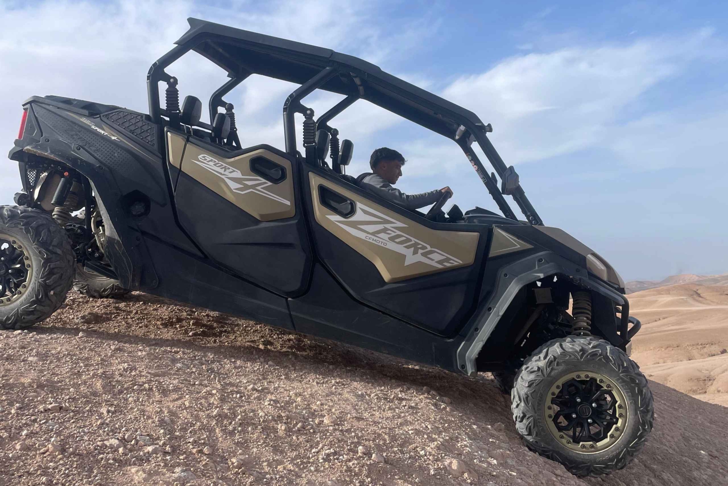 Kasta dig ut i ett oförglömligt äventyr ombord på en terränggående buggy genom Agafay-öknen. Denna 1000 cc-fordon är perfekt för dig som söker spänning och låter dig utforska oländig terräng och uppleva adrenalinfyllda stunder. Privat aktivitet med din guideinstruktör. Din halvdagstur tar dig till hjärtat av Agafayöknen, en spektakulär plats strax utanför Marrakech. En erfaren guide kommer att följa med dig under hela resan och ge dig en fullständig säkerhetsgenomgång samt all nödvändig utrustning för att garantera din komfort och säkerhet, inklusive hjälm, skyddsglasögon, balaclava och en vattentät jacka om det behövs.Includes
