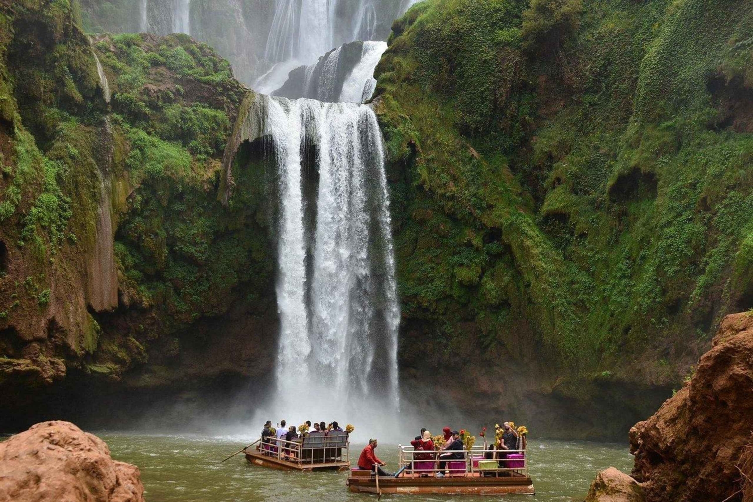 Fly den livliga staden Marrakech och bege dig till den lugna skönheten i Ouzoud-vattenfallen på en dagsutflykt. Din resa börjar med upphämtning från ditt hotell eller riad, innan du åker till ett av de mest spektakulära vattenfallen i Nordafrika, som ligger 150 km norr om Marrakech. Du kommer att köra genom de frodiga Tadla-slätterna, prickade med olivträdsgårdar och fruktträdgårdar. det kommer att finnas chans för cafébrytning innan du når platsen. Vid ankomsten, ta en lugn. Följ din lokala guide och promenera ner till vattenfallets bas, där du kommer att hälsas av de fantastiska 110 meter långa kaskaderna och en permanent regnbåge, beundra utsikten och ta bilder. Fortsätt längs ett nätverk av stigar till en utkiksplats där du kan köpa färskpressad apelsinjuice. Ta en snabb tur i en traditionell båt på poolen som ligger vid basen av vattenfallen. Ladda upp med en berberlunch med utsikt över fallen. innan du återvänder till byn Längs vägen kan du få nya vänner med de vänliga lokala berberaporna. Avsluta dagen med en smidig avlämning vid ditt hotell eller närmaste tillgängliga punkt i Marrakech. Denna tur är en perfekt balans mellan äventyr och avkoppling, vilket gör det till en verkligt oförglömlig upplevelse.Includes
