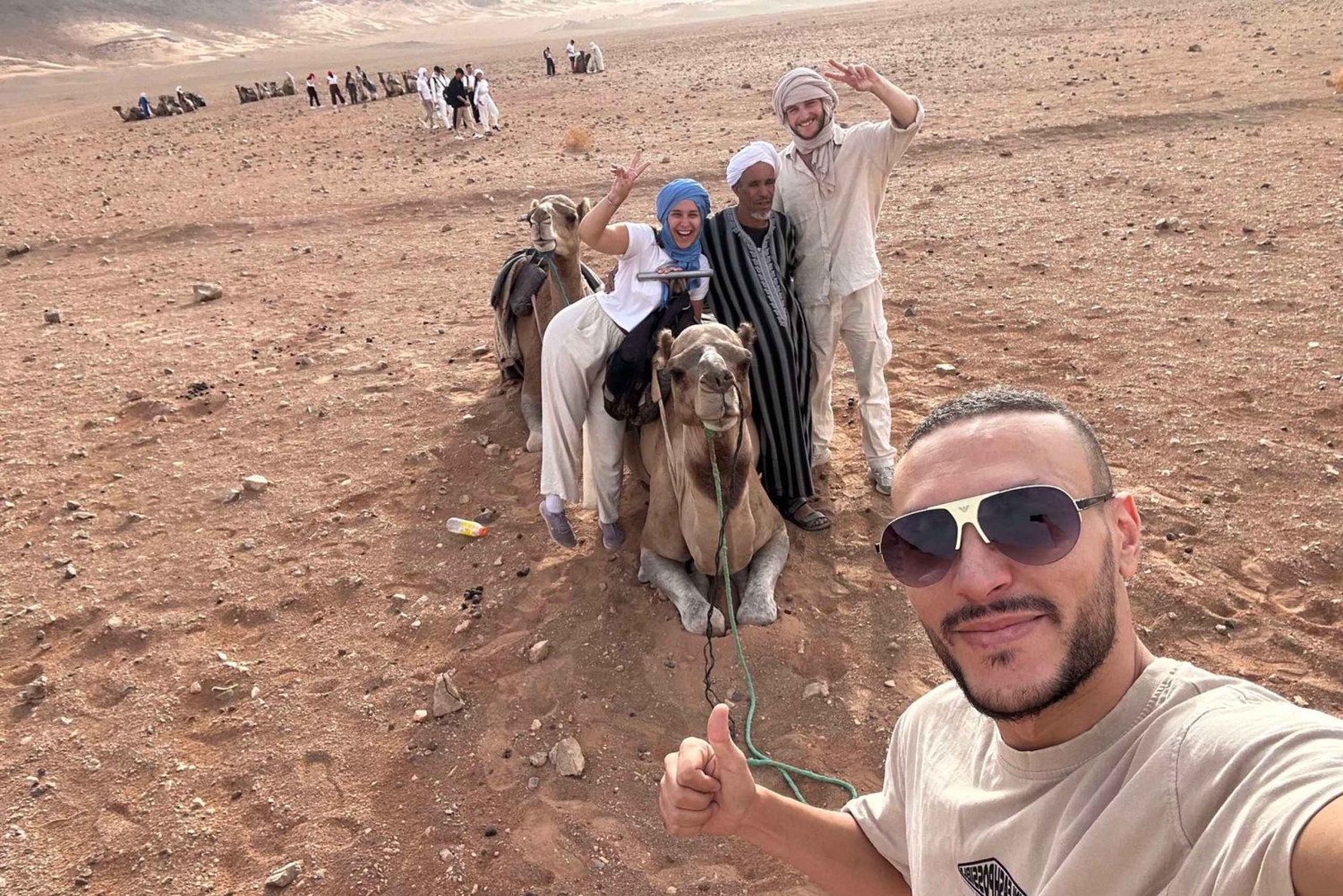 Ökenäventyr med fyrhjuling, extra och kamelridning i solnedgången, middag och folklore-show Fly staden och dyk ner i Agafay-öknen på ett oförglömligt äventyr från Marrakech. Din resa börjar med en naturskön 40-minuters bilresa, med stopp längs vägen för traditionellt mintte och ett besök på ett kvinnokooperativ för arganolja. När du väl är i öknen, gör dig redo för en spännande fyrhjulingstur genom karg terräng och vidsträckta, öppna landskap. Känn spänningen när du navigerar på klippiga stigar och beundrar de hisnande omgivningarna. Efter turen kan du njuta av en lugn kamelvandring under den gyllene timmen, när solen går ner över öknen och målar himlen i levande nyanser. Ta fantastiska bilder och njut av lugnet i detta unika landskap. När du anländer till ett charmigt ökenlandläger välkomnas du med marockanskt te och sötsaker innan du gör dig redo för en magisk kväll. Ät middag under stjärnorna med en traditionell marockansk måltid med tagines, couscous och lokala delikatesser. Kvällen vaknar till liv med livemusik, magdans och en spektakulär eldshow, vilket skapar ett oförglömligt firande av marockansk kultur. Den här ökenupplevelsen är perfekt för äventyrslystna, par, familjer och alla som vill känna Marockos själ.Includes